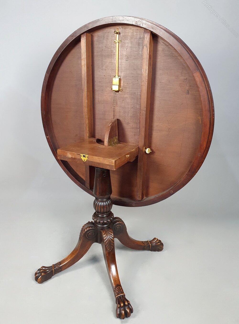 The table is stamped on the top of the column and here is another fine quality detail, a small hinged flap or fly which can be raised when the table is tilted to prevent it dropping back. A lovely detail which I have not seen on any table of this period and even this with a finger hold cut out to make the fly easy to use.