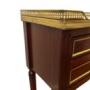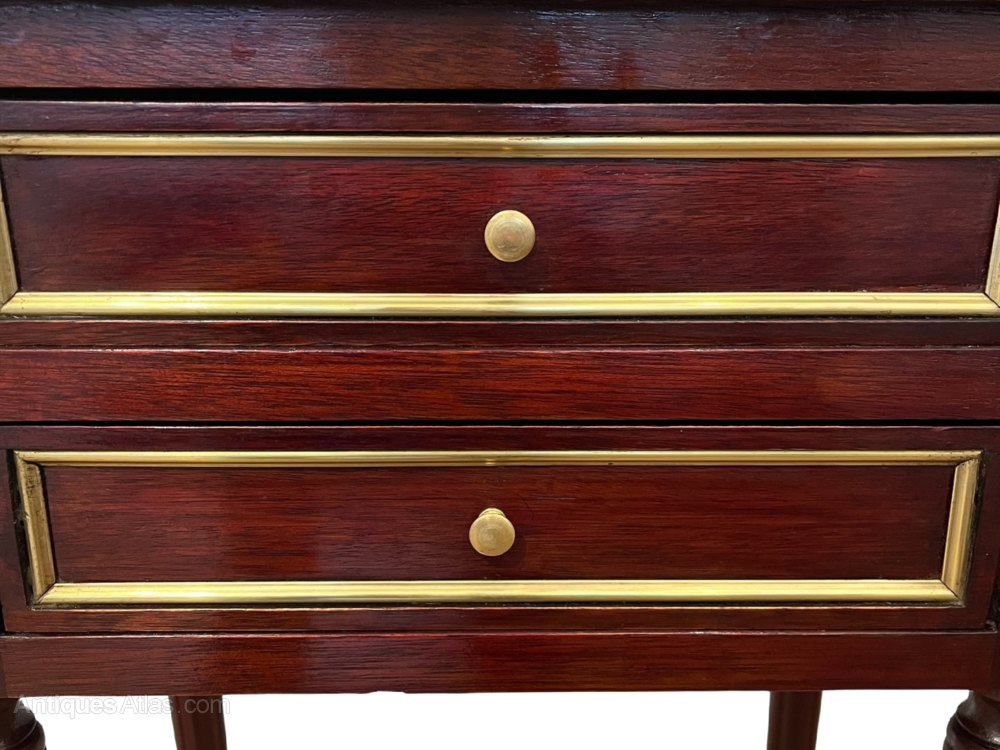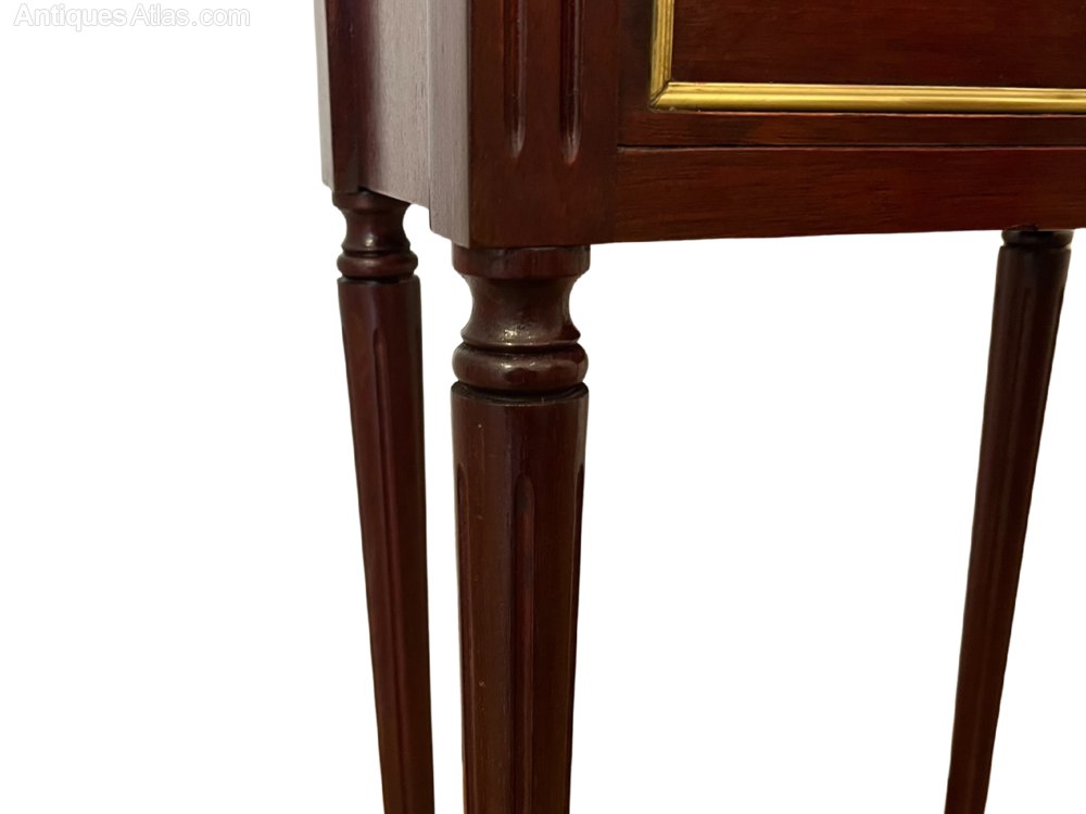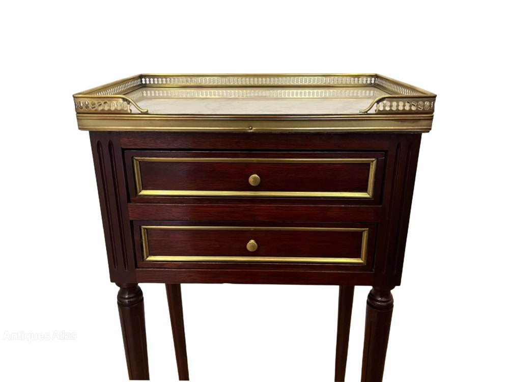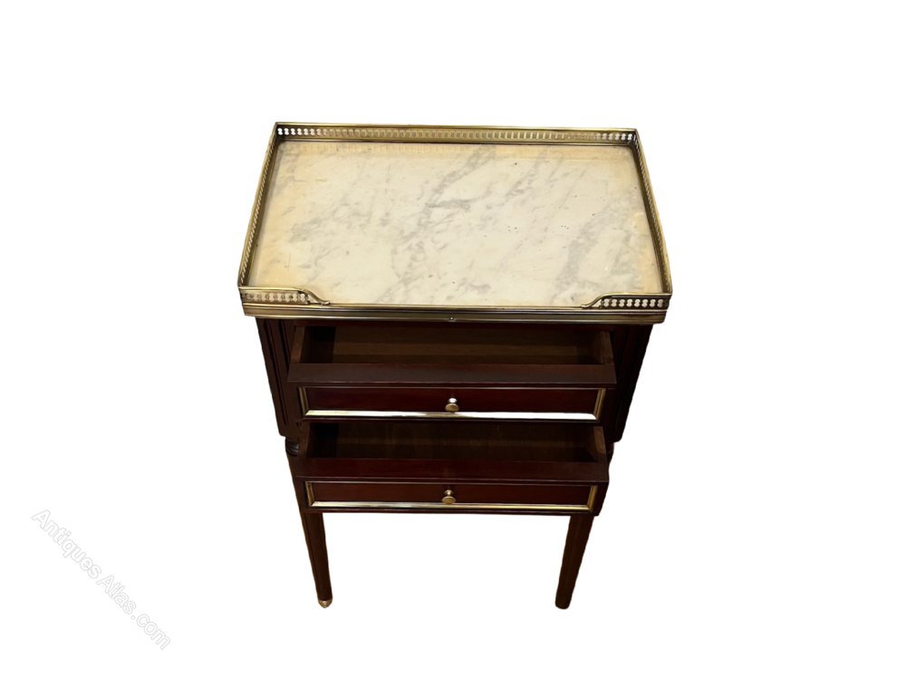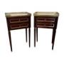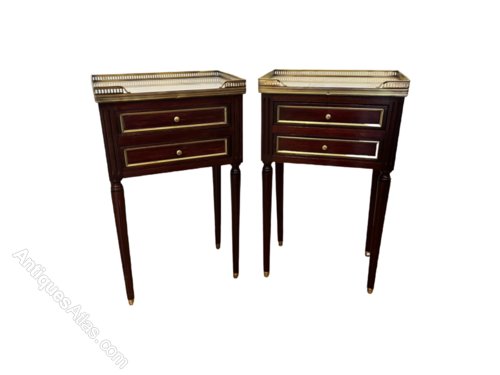 A fine pair of mahogany bedside tables in the Louis XVI style. Each with carrara marble tops and pierced brass galleries.These cabinets comprise of two drawers with brass mounts throughout.