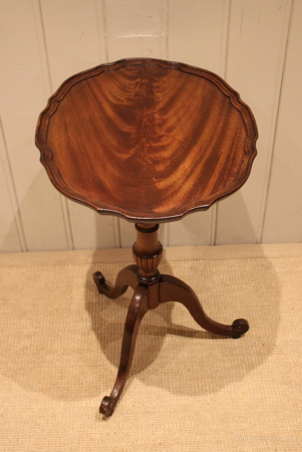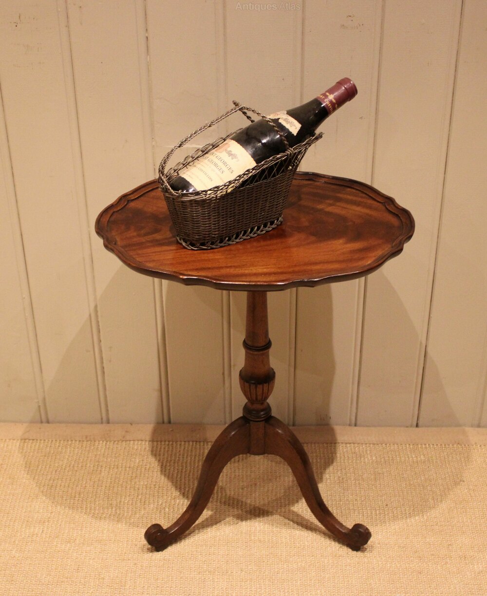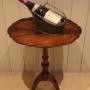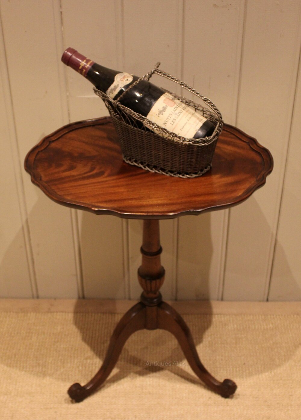 Mahogany oval top wine table having a pie crust edge raised on a turned tripod base .Height