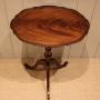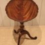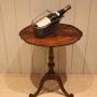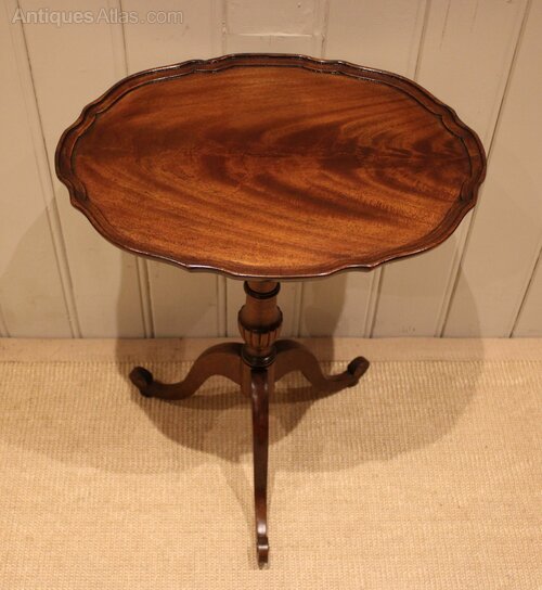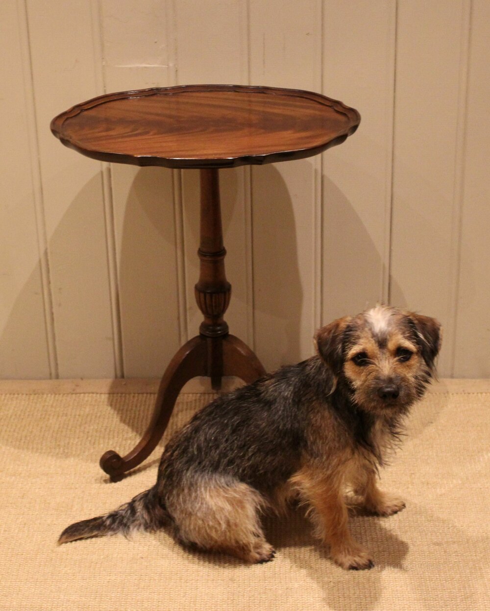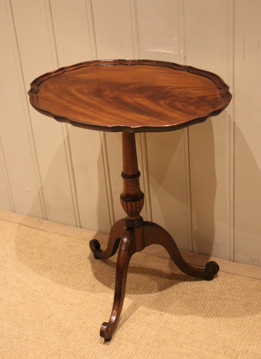 Mahogany oval top wine table having a pie crust edge raised on a turned tripod base .Height