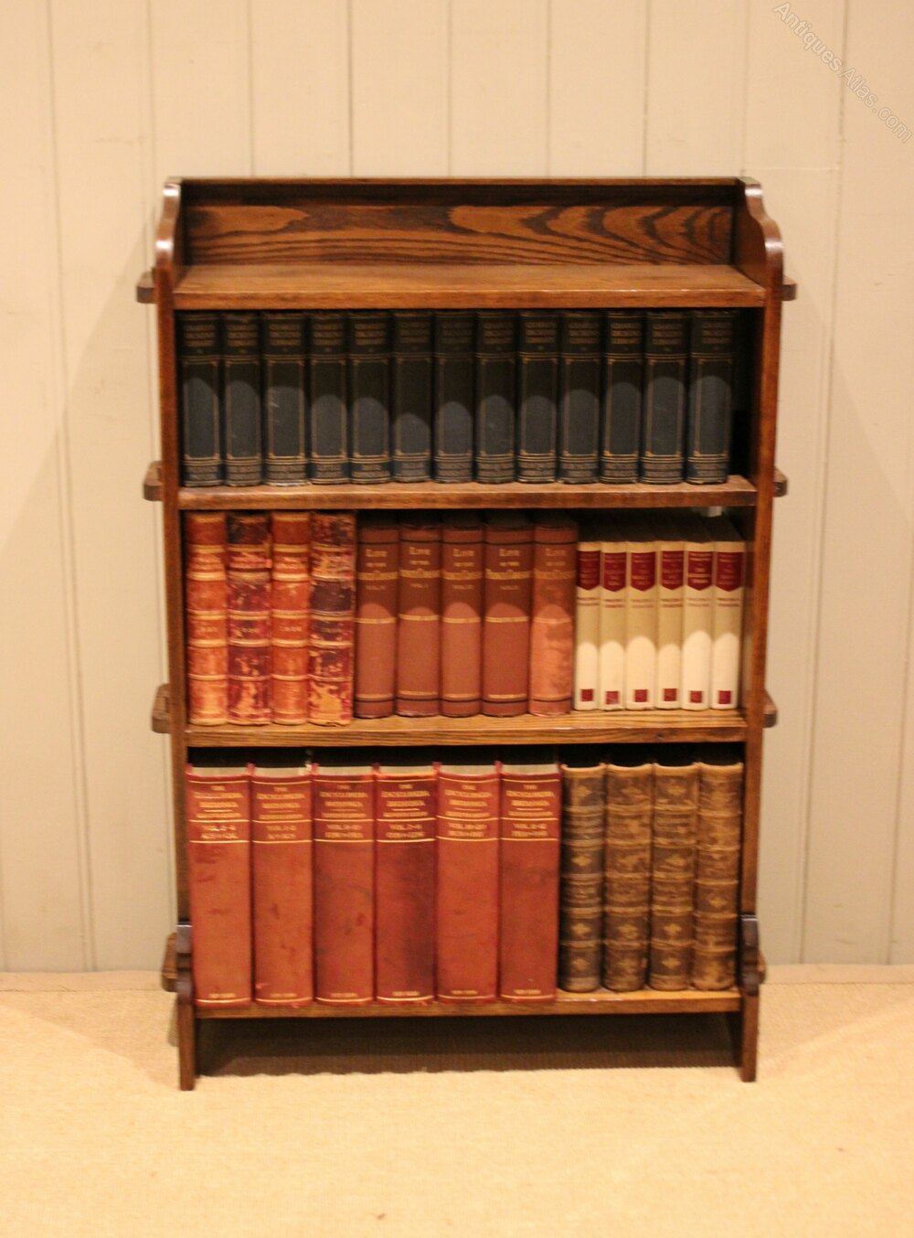 Solid oak open bookcase having three shelves with pegged sides , the internal shelf measurements are 63.5cm wide , from the bottom up 20.5 cm deep , 19 cm deep and 19 cm deep.Height