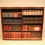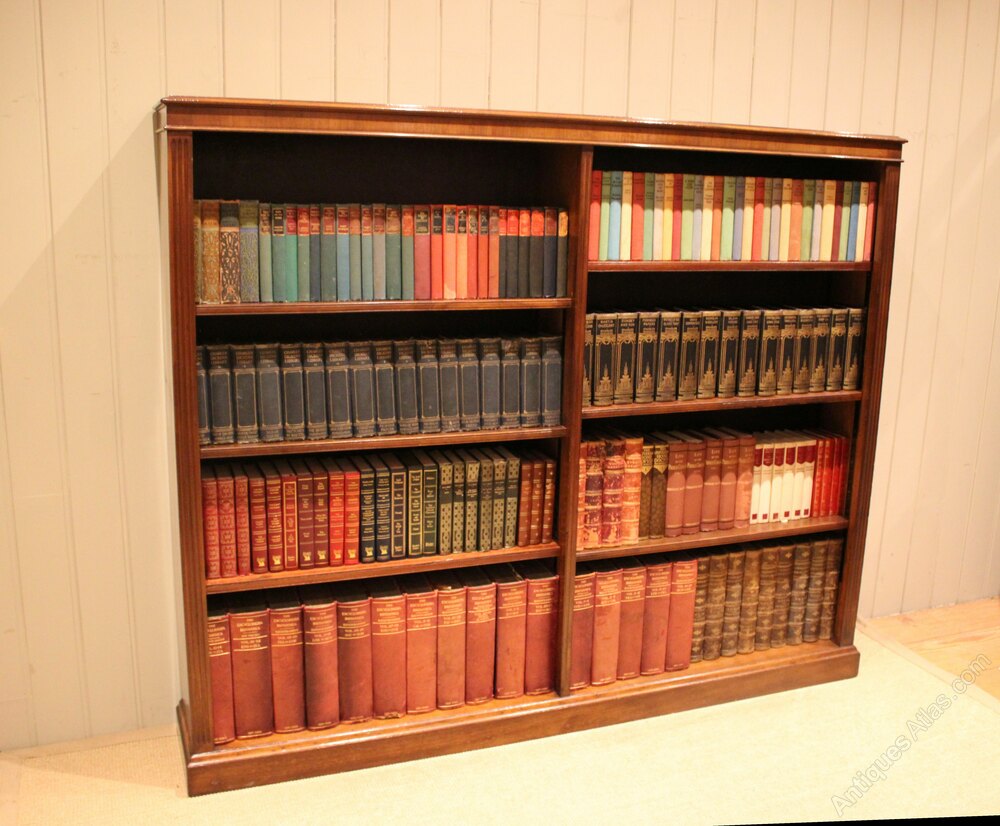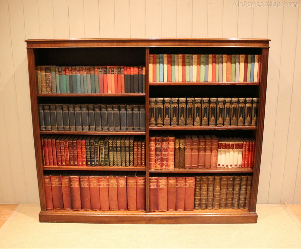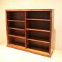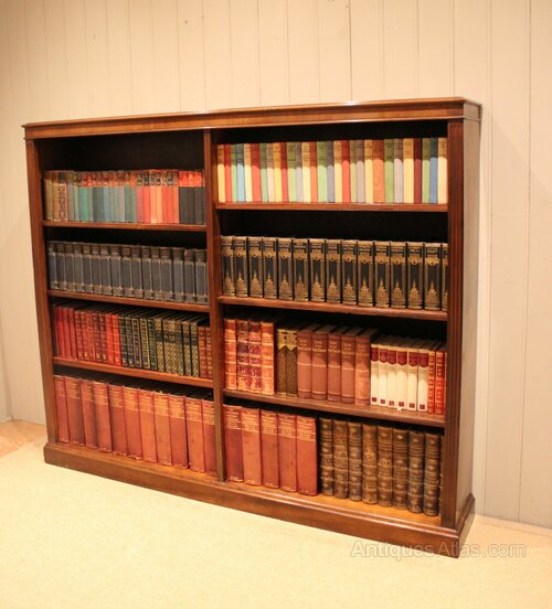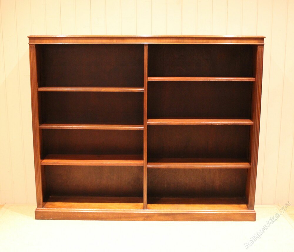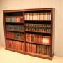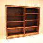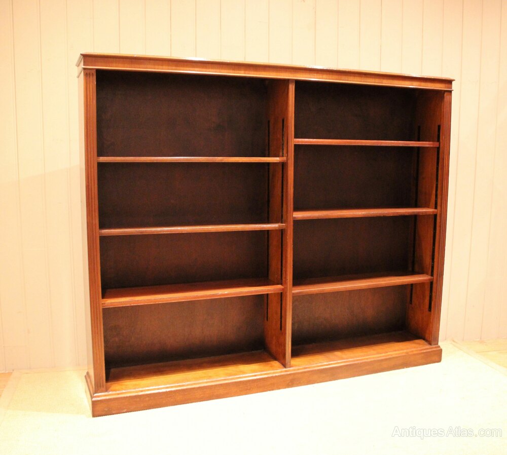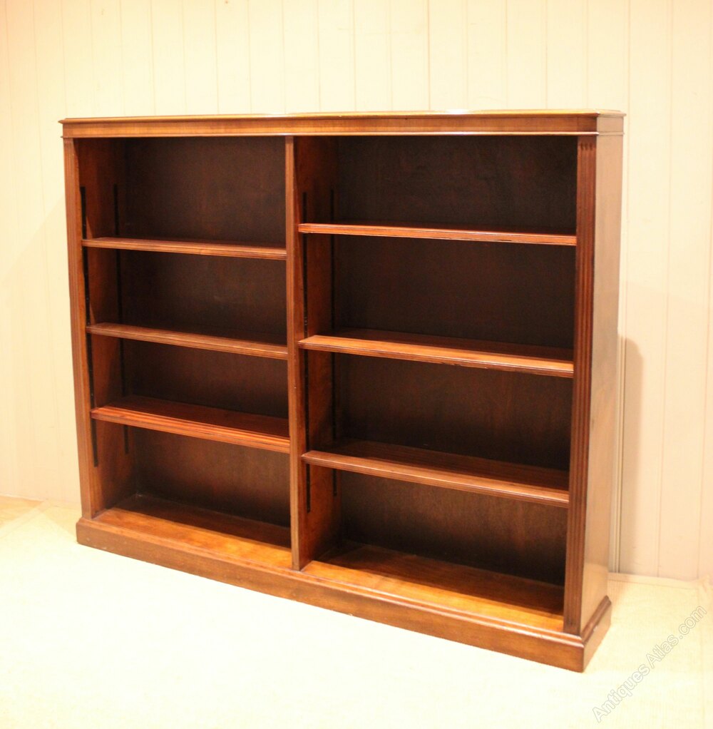 Edwardian walnut open bookcase having two sections each with three adjustable shelves , raised on a plinth base . The shelf dimensions are 76 cm wide and 23 cm deep .Height