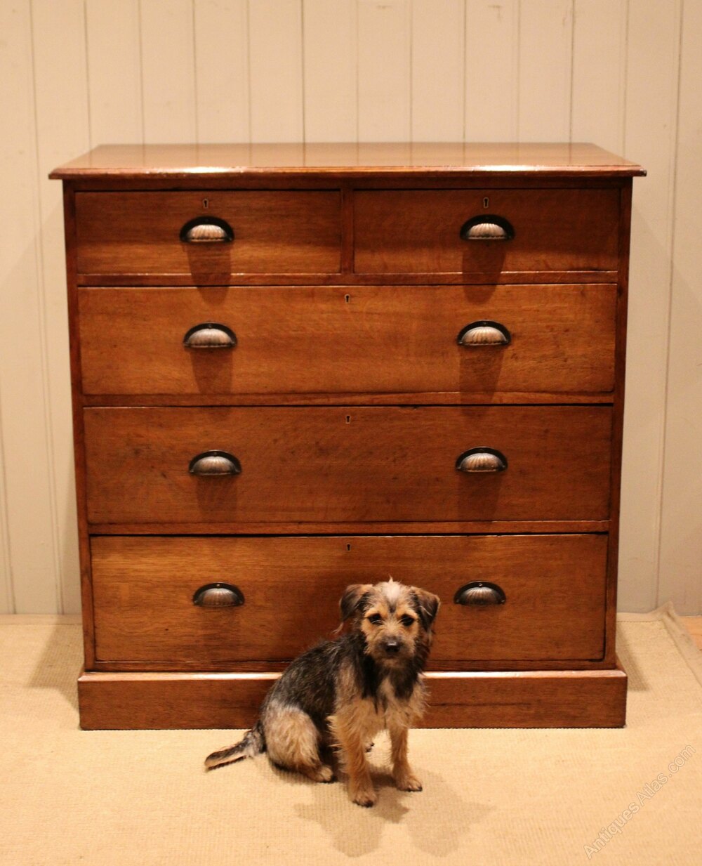 Substantial solid oak chest of two short and three long graduated drawers with decorative fluted handles , raised on a plinth base. The drawer depths from the bottom up are 23.5 cm , 20.5 cm , 17.5 cm and the top two are 12.5 cm deep .Height