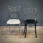 One style has cream vinyl seat pads with a taller backrest, the frame is tubular chrome. The other has black vinyl seat pads and has a lower backrest of tubular chrome with black legs and stretchers.