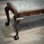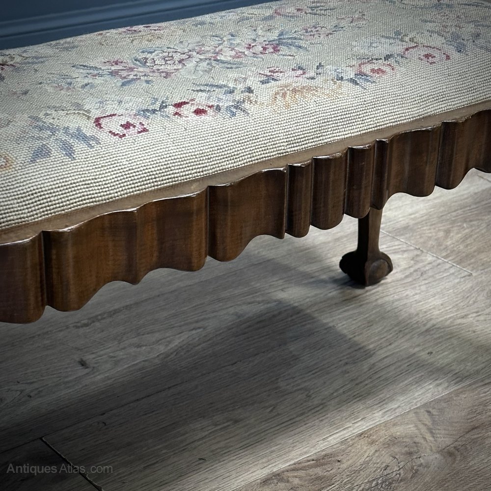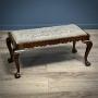 The stool has an attractive carved apron below the seat pad. The seat pad is padded and upholstered in a beige tapestry that has a floral pattern.