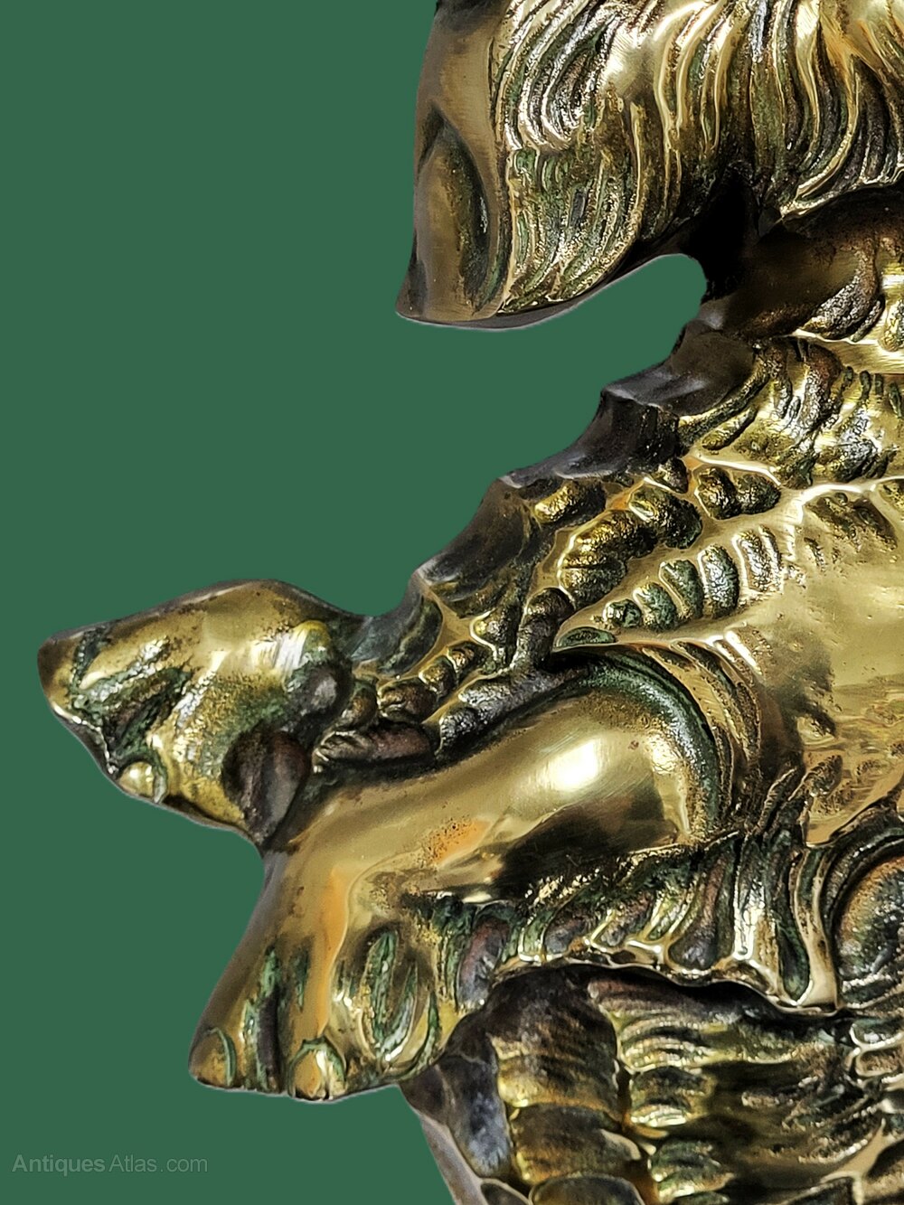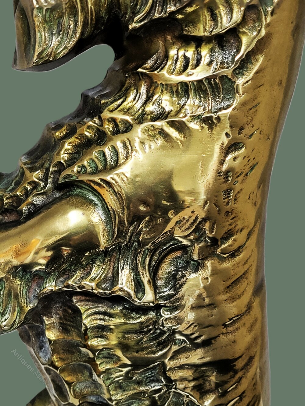 Extra Large Brass Scottie Scots Terrier Dog Door Stop. He stands 42 cm tall and 25 cm from his back toe to the tip of his tail.He is heavy and weighs over 4 kilos. Ideal as a doorstop, or a decorative fireside figure, where he will catch the light from the flames and also retain some of the lost heat from the fire.
