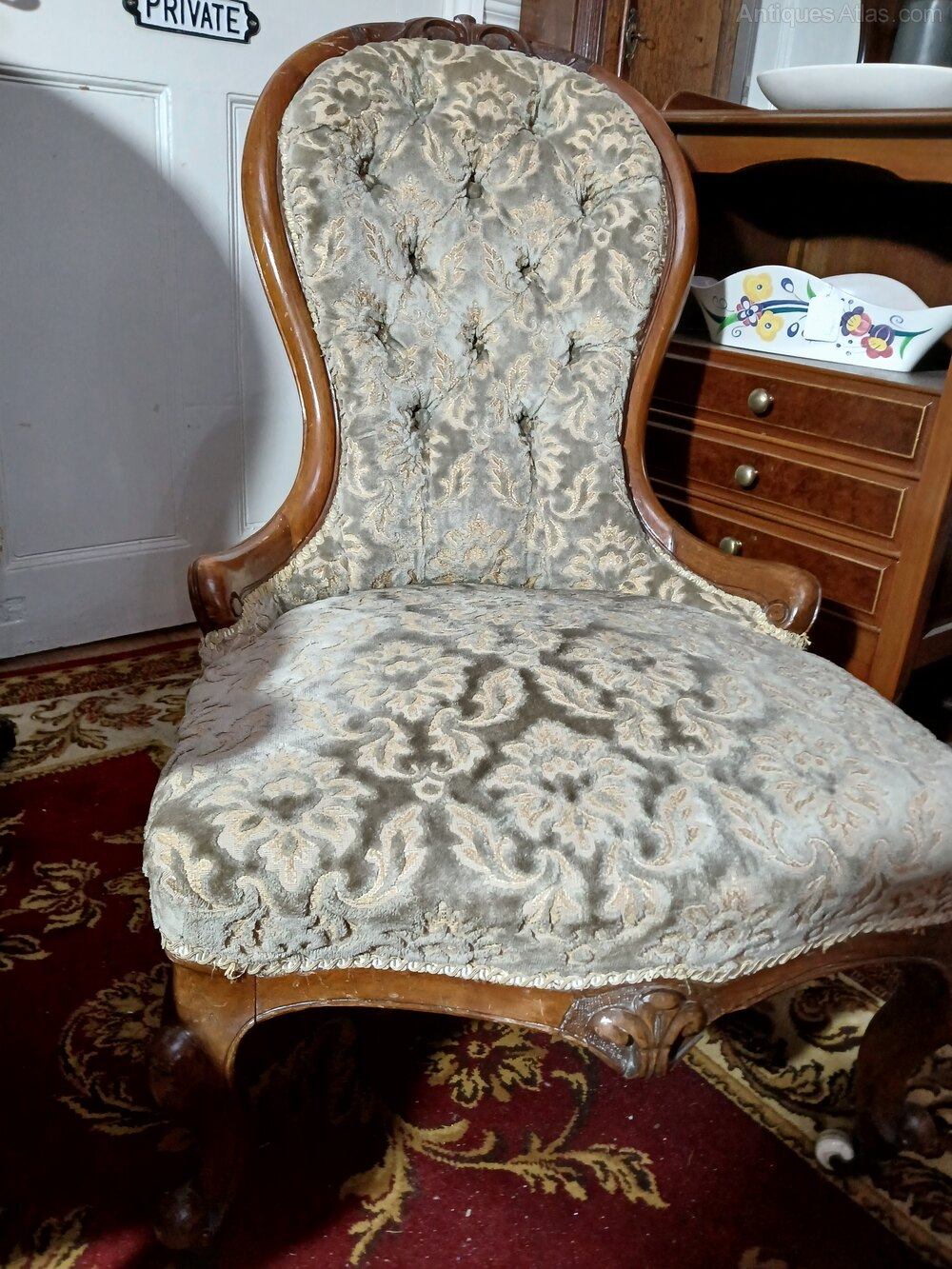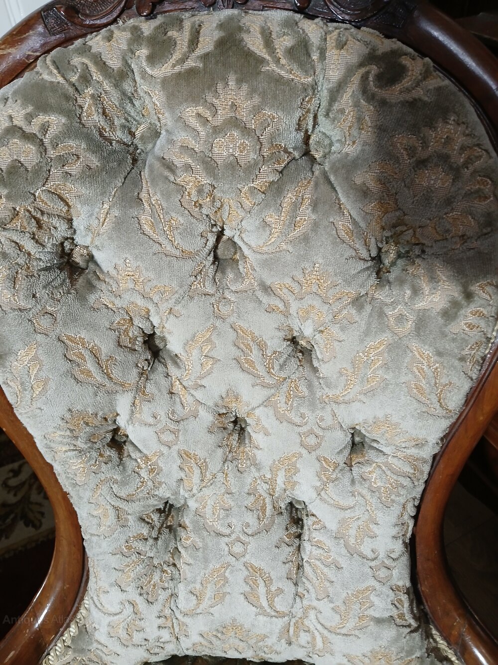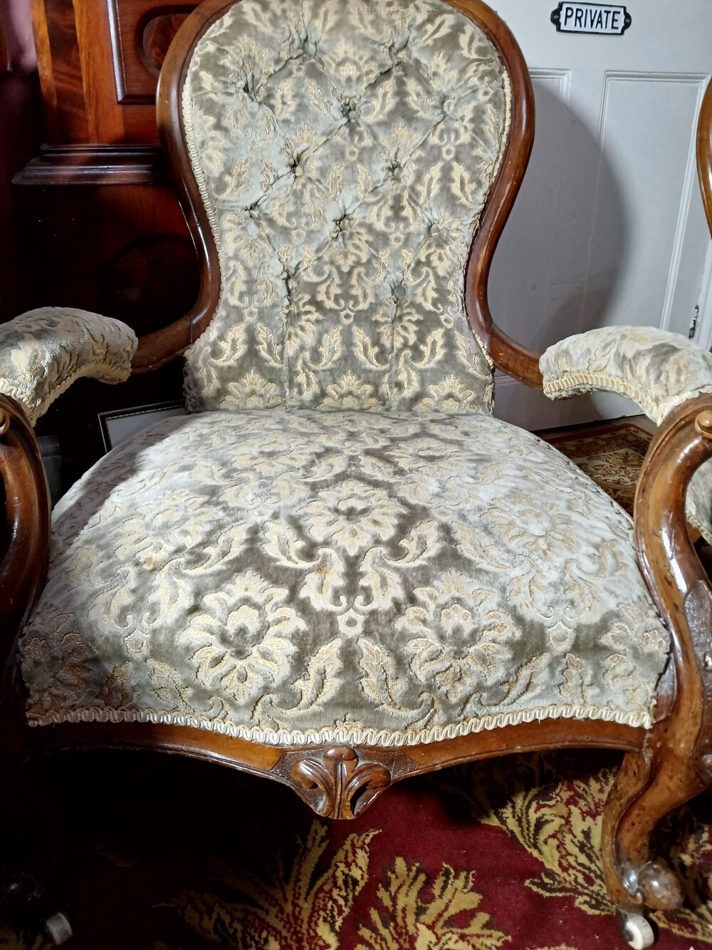A very nice Ladies and Gents Pair of Walnut Framed Armchairs in very good condition. Nicely upholstered. No loose joints or worm and very comfortable. Price is for the pairWe have been dealing in antiques for over 4o years and gained a vast amount of knowledge. We carry out research for most of our items giving our customers some history to their purchases.