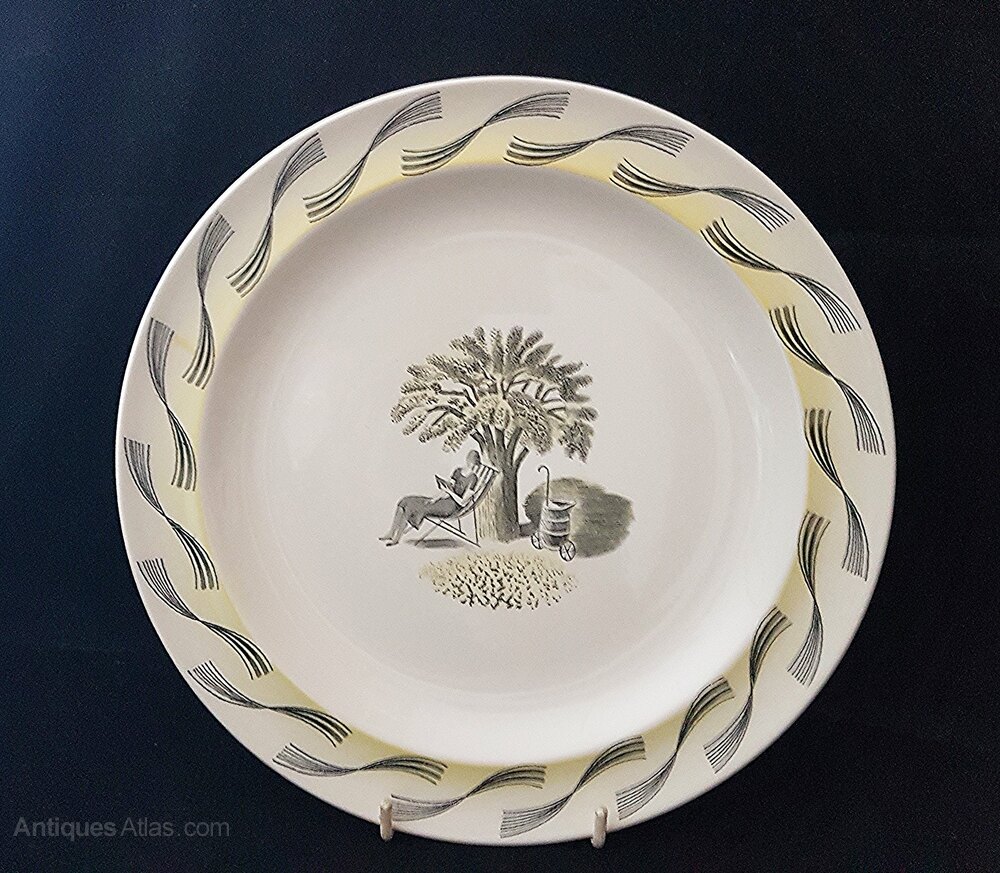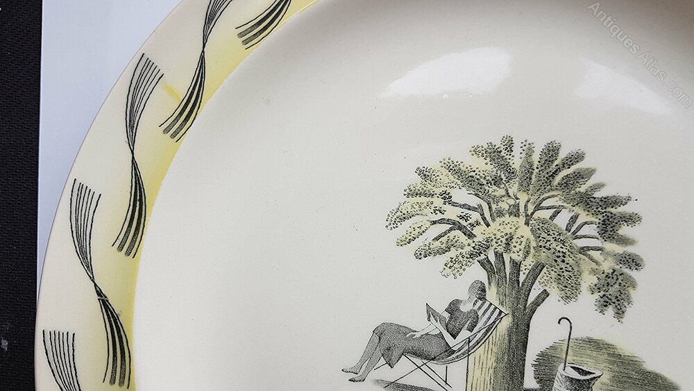 A 9.25 inch Garden plate, designed by Eric Ravilious for Wedgwood featuring a vignette of a lady sitting under a tree in a quintessential 1930's English country scene. Designed by Ravilious in the 1930's and issued by Wedgwood in the 1950's. In excellent clean condition with no chips, cracks, transfer loss or crazing. A tiny brush mark as shown.23.5cm