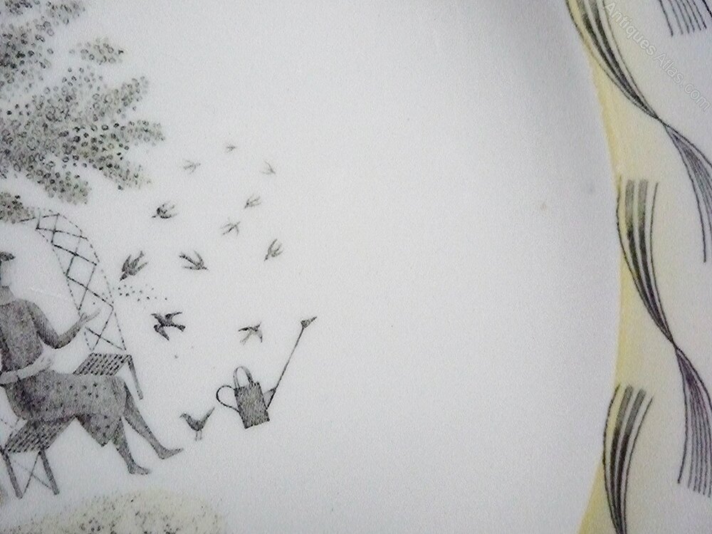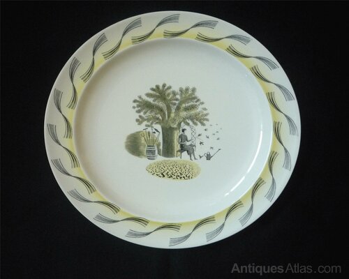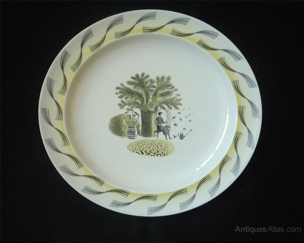 A super 10 inch plate from the Garden series, designed by Eric Ravilious for Wedgwood featuring a vignette of a lady sitting under a tree in a quintessential 1930's English country scene. In good vintage condition with no chips, cracks, transfer loss or crazing. There are two small underglaze dust spots from firing as shown in the photo and a few usage marks visible when viewed close up and held to the light. Impressed 1953. Displays beautifully25.5cm diaDate1930s :