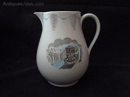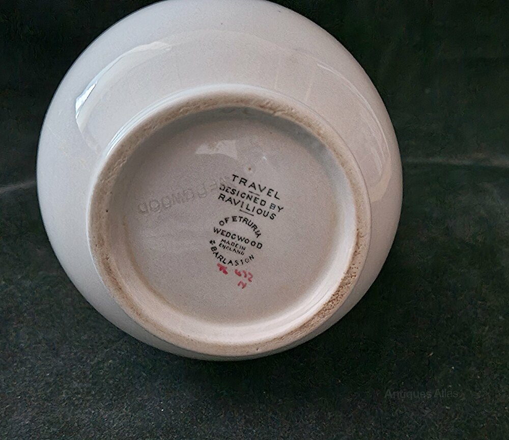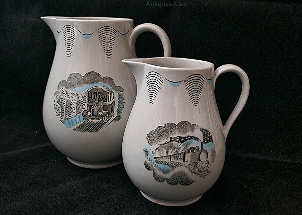 A rare, large Wedgwood milk jug in the 'Travel' design by Eric Ravilious and in good used condition. No chips, cracks, crazing or pattern loss. A couple of the usual underglaze specks from firing. Designed by Ravilious in the 1930's, the Travel range was only issued by Wedgwood in the early 1950's. Features the rare right hand drive bus on one side and the snowstorm pattern on the other. Photo 4 is shown for comparison only. 14.5cm highDate1950s :