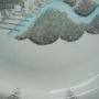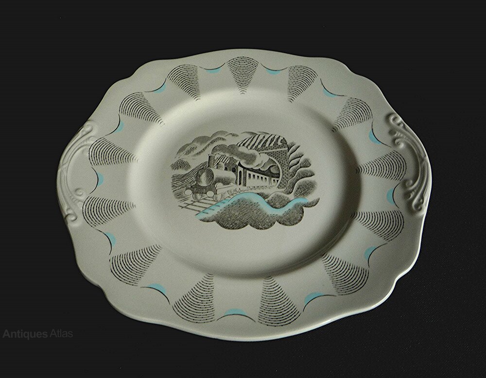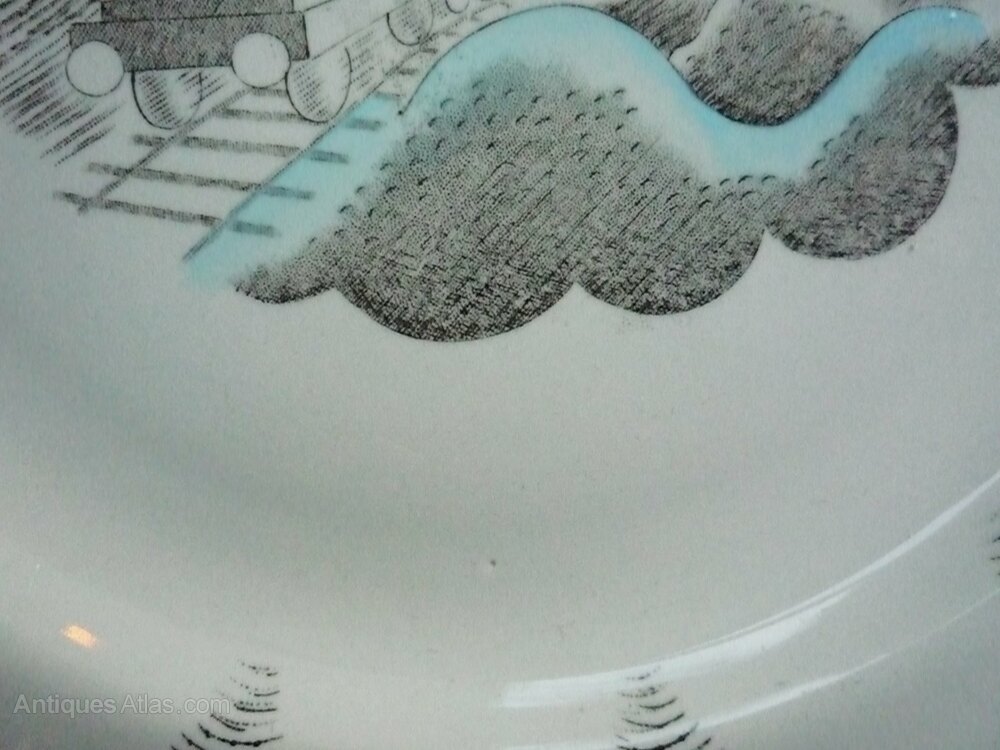 This 10 inch Ravilious Travel design sandwich/cake plate is in very good vintage condition with no chips, cracks or hairlines. Hard to notice but there is a tiny pin prick in the glaze from manufacture, shown in photo 2. Priced accordingly. Features raised scrolled edges to the side decorated in the centre by a train emerging from a tunnel. An impressive display piece and fully marked to the base and impressed '53'. Any white marks are from the cameraDate1950s