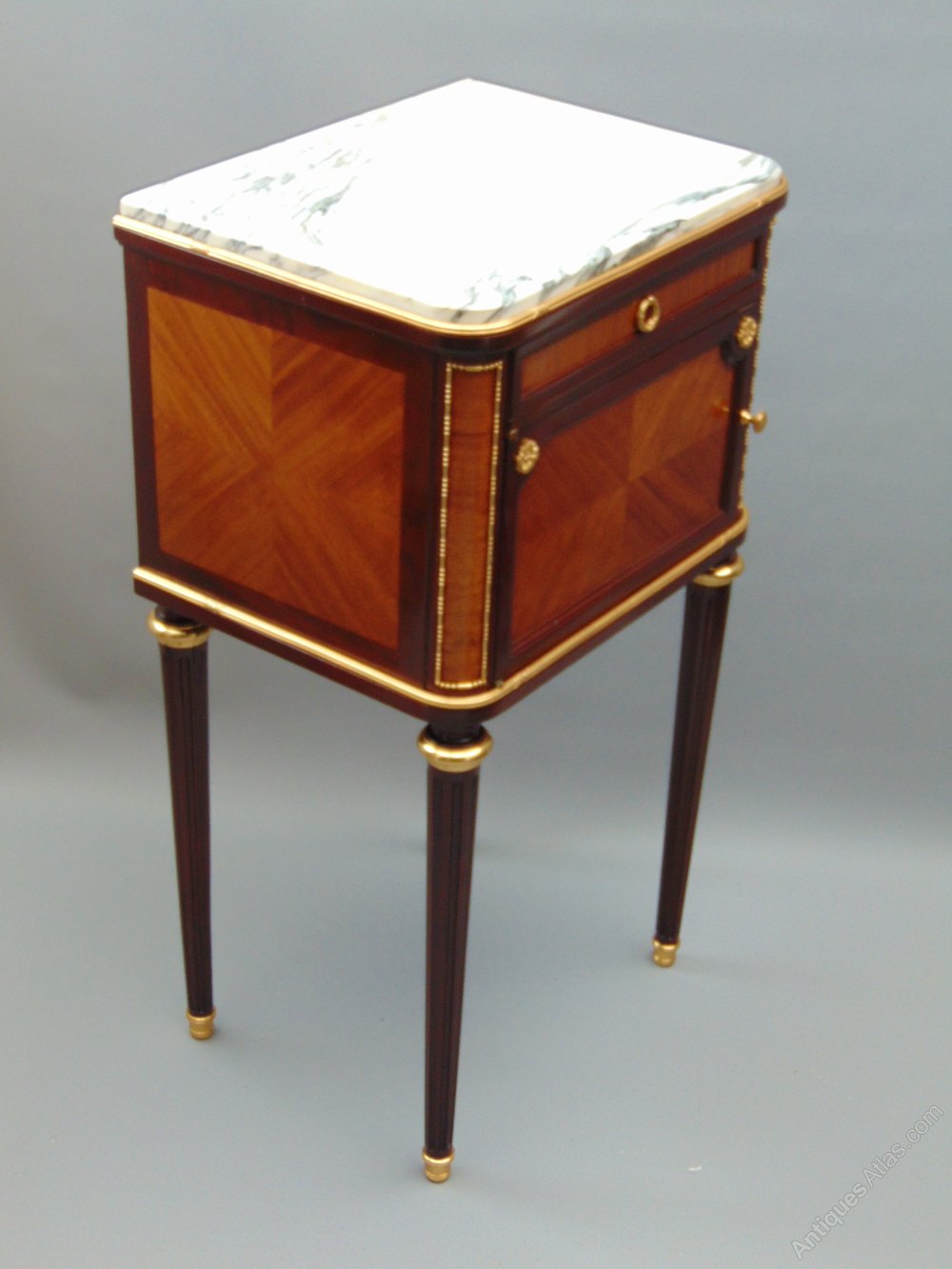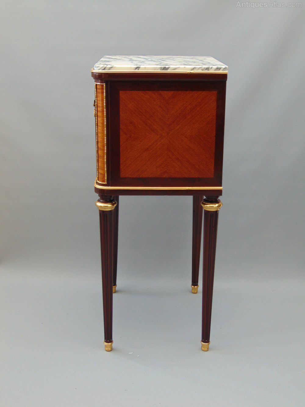 A superior quality Pair of Side Cabinets each having quarter mahogany Veneers to the fronts and sides which is framed with Solid Mahogany , Ormolu mounted through out , the Oak lined Dove Tail jointed drawers have the tops edged in Mahogany , the tops and interiors are Carrera Marble and have grey Veins .These Cabinets were made by Frederick Schmit one of the greatest Cabinet makers in the second half of the 19th century , active in Paris at the Rue de Charonne starting in 1856 , he received Gold medals in the 1878 and 1889 Expositions Universelles in Paris .