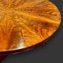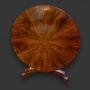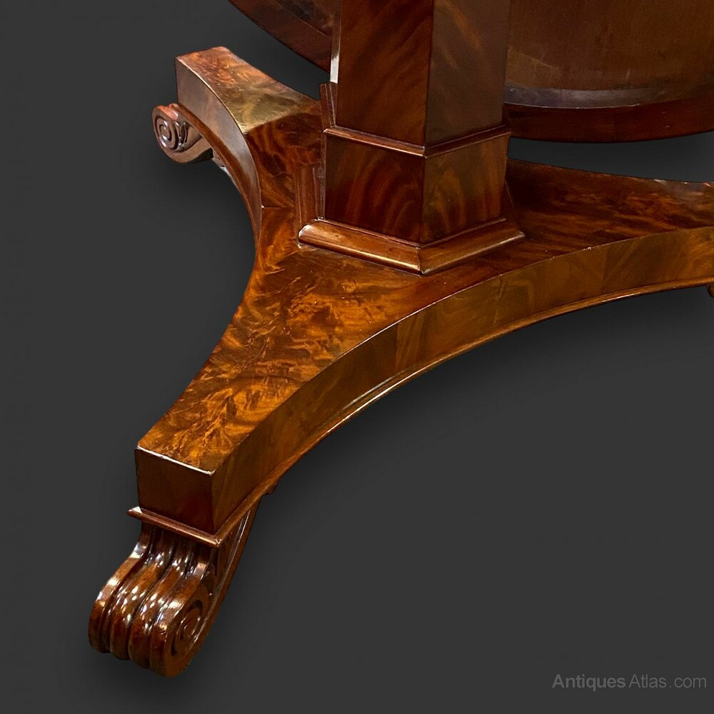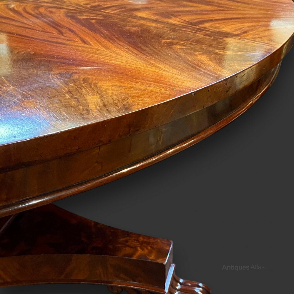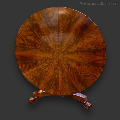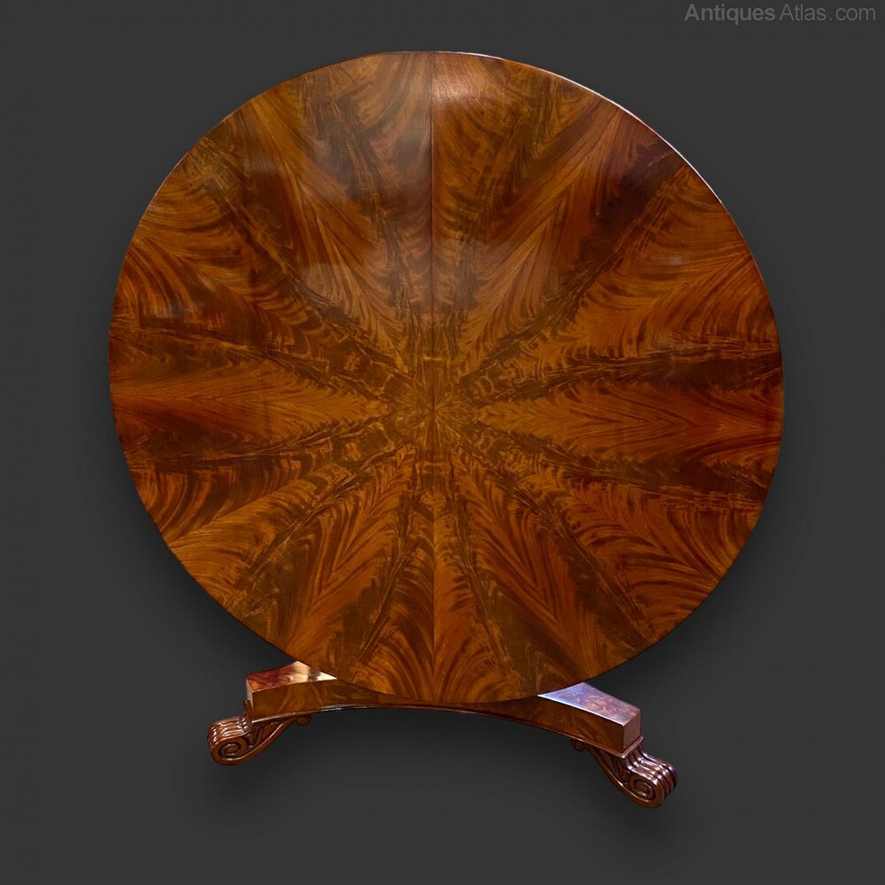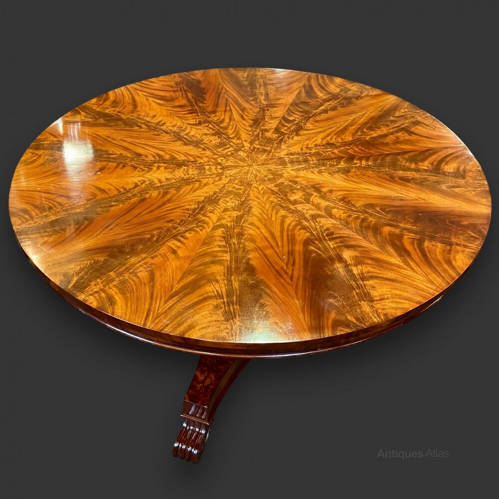 A superb Mahogany Centre or Dining Table having a beautiful flame mahogany segmented top on a platform style base with carved scroll feet.English Circa 1820