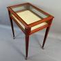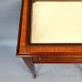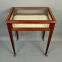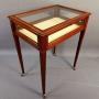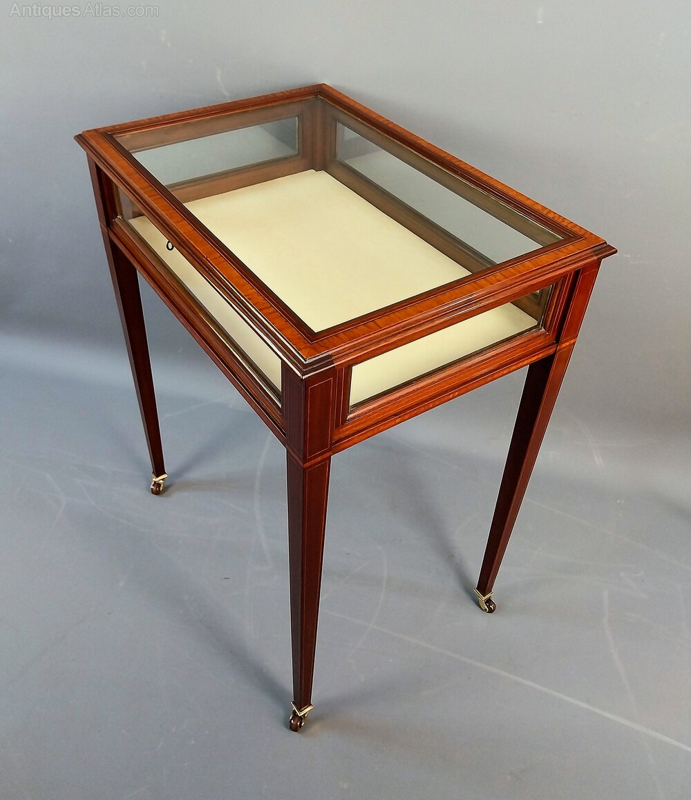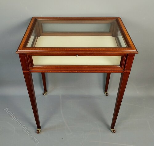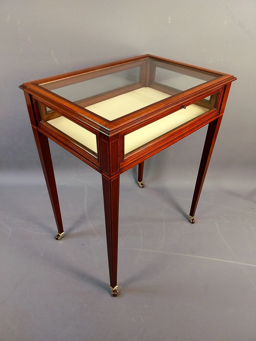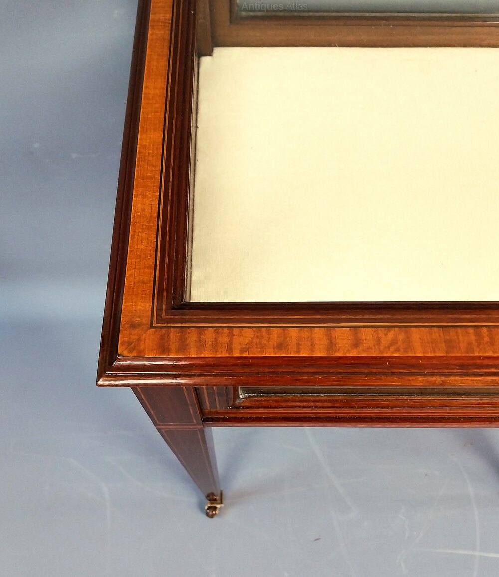 A superb quality Mahogany Bijouterie Display Table with broad Satinwood crossbanding and fine line inlay throughout the entire pieces, the glazed lid opens to a cream material lined interior, the sides also benefit from being glazed and the elegant legs taper and are finished with brass & porcelain castors.English Circa 1900
