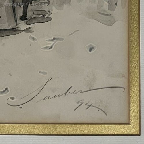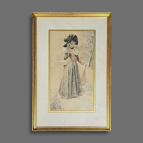 Watercolour portrait study by Robert Sauber, circa 1894. The work is executed in monotone with white highlights and depicts an elegant young lady holding a parasol. The piece demonstrates the artist’s fine draughtsmanship and sensitivity to detail.Robert H. Sauber was born in London in 1866 and studied at the Julliene School of Art in Paris and also studied in Vienna. He was an artist/illustrator, and opened a school for artists in his Kensington studios that was unfortunately destroyed along with many of his portraits and works of art due to enemy action in WWI.