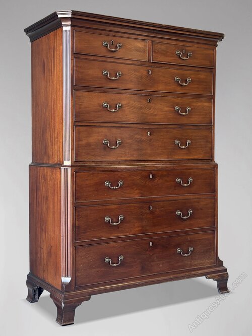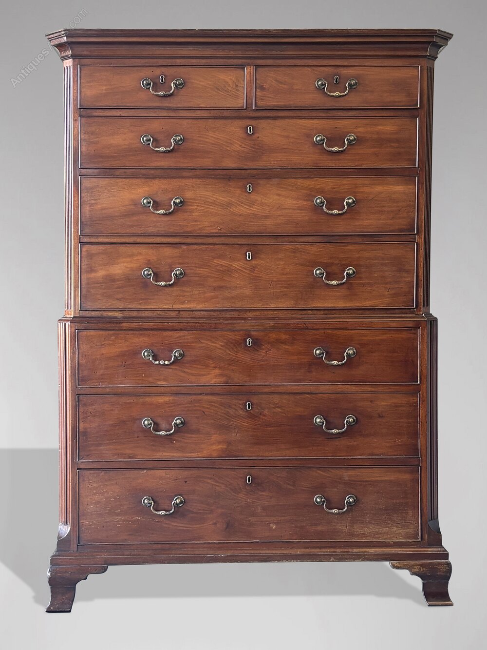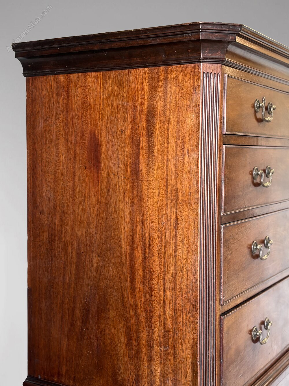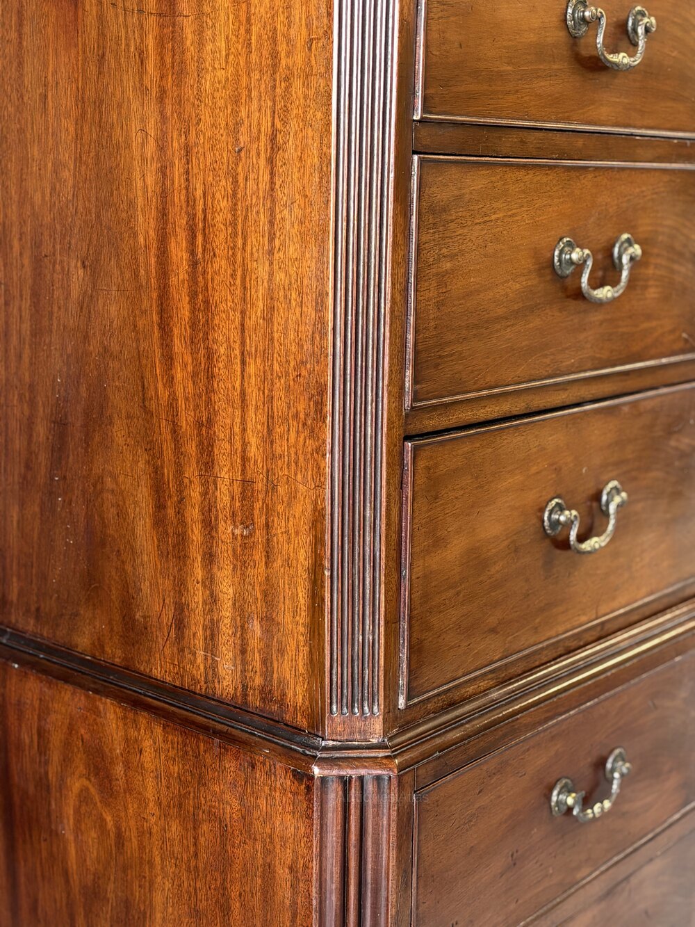 Untouched 18th-Century George III Period Mahogany Chest-on-Chest or TallboyAn untouched late 18th-century George III period figured solid mahogany chest-on-chest, with a moulded cornice above two short and six long, cockbeaded, graduated oak-lined drawers, fitted with the original finely cast brass swan-neck handles and escutcheons, and flanked by reeded, fluted pilasters. The whole stands on its original ogee bracket feet. Circa 1780.