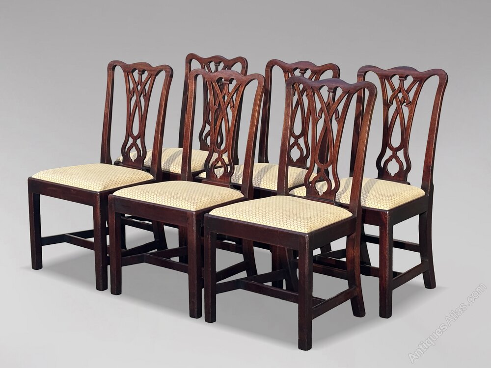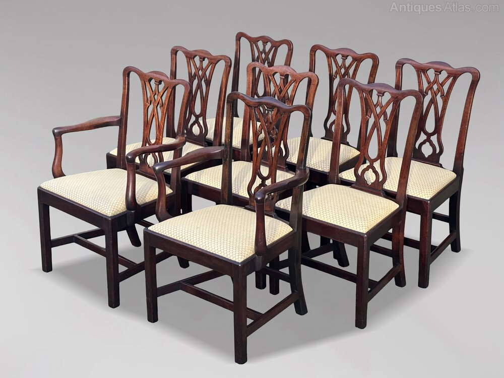 Handsome Set of Eight (6+2) George IV Period Mahogany Dining ChairsA handsome set of eight antique solid mahogany dining chairs in the classic Chippendale style, dating from around 1830 and comprising two armchairs and six single chairs. The quality is excellent, and the design particularly attractive. The backs are pierced with fine fretwork, and the legs are double stretchered for extra stability. All chairs have drop-in upholstered seats, with the two carvers matching the six singles. The mahogany has a gorgeous colour and patina, and the original polish finish has been retained.