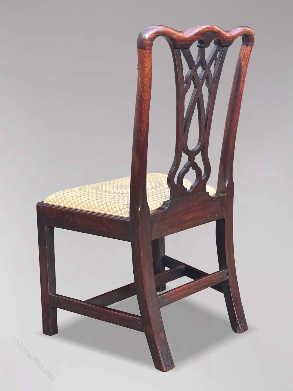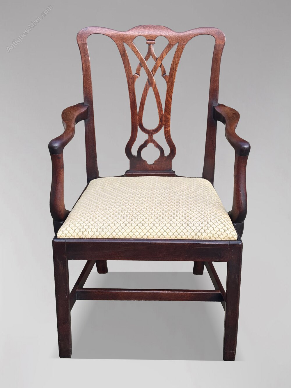 Each chair features a shaped and carved top rail with moulded uprights and a pierced, carved central splat the armchairs also have shaped and moulded arms. This leads down to drop-in upholstered seats in a neutral fabric, currently in good condition (and easily re-upholstered in a fabric of choice if desired). The chairs stand on square moulded front legs with shaped corner brackets at the top, joined by a double H-stretcher, with splayed back legs.