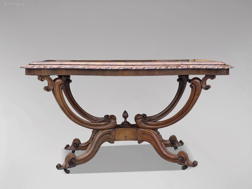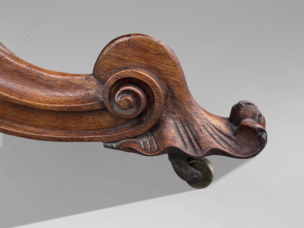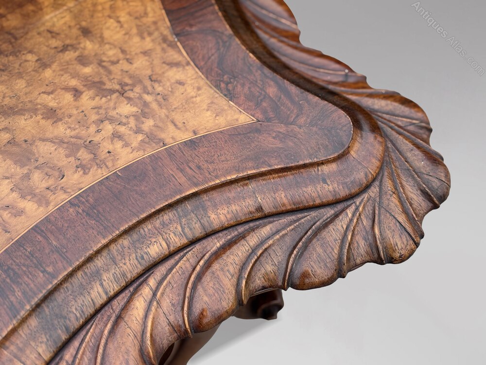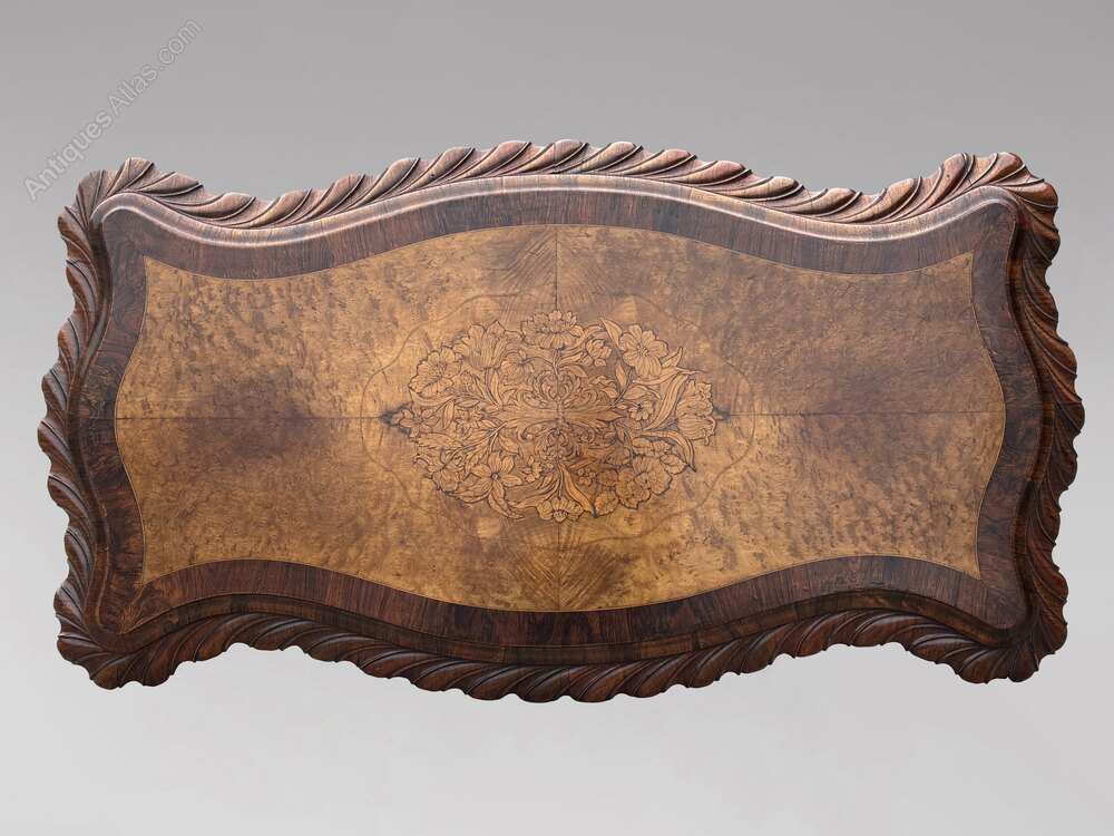 Very Fine & Elegant Mid 19th-Century Victorian Burr Walnut Carved Centre TableA superb example of mid 19th century English craftsmanship, this very fine Victorian burr walnut carved centre table combines exceptional quality, striking design and real decorative presence. Dating from 1850, the table features a beautifully shaped top in richly figured burr walnut, displaying wonderfully vivid grain patterns. The surface is framed with refined rosewood crossbanding and a carved moulded edge, all resting on an impressive solid walnut, basket shaped “birdcage” base. The base stands on elegantly shaped legs with finely carved details, each terminating in the original brass castors. The table also retains its original carved finials, both to the top and the lower stretcher, a mark of its completeness and quality. The colour and patina are entirely original, with a warm, characterful glow that only well preserved period furniture acquires over time. Structurally sound and in excellent original condition, this is a top quality piece throughout.