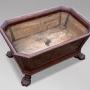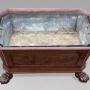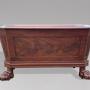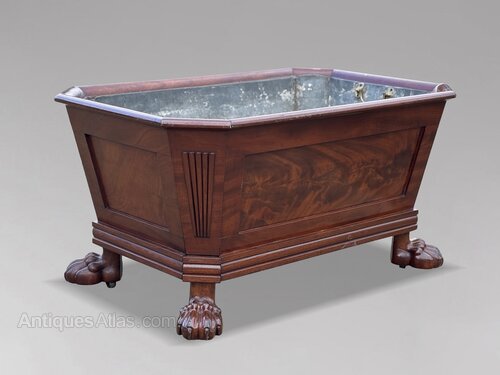 Inside, the original zinc (or lead) liner with a pair of brass swan neck handles remains intact, a mark of both quality and authenticity. The overall form, use of richly figured mahogany, and the distinctive carved paw feet are closely associated with leading Regency cabinetmakers such as Gillows of Lancaster London, to whom comparable examples are often attributed.