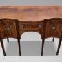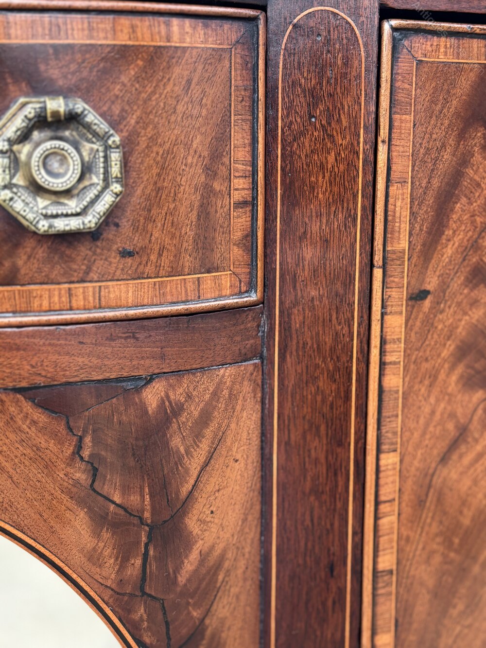 Of very attractive, practical small proportions, this sideboard features a well figured solid mahogany serpentine top with satinwood stringing to the edge and finely crossbanded inlay to the drawers. The front is beautifully shaped, with a combination of convex and concave drawer fronts, veneered in symmetrically arranged flame mahogany and finished with inlaid and crossbanded borders.