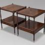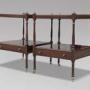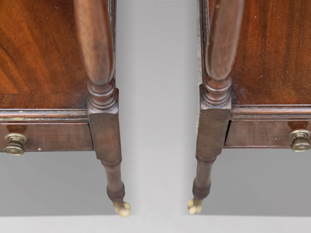 Each table features a mahogany cross banded top with a moulded edge, raised on four finely turned column supports surmounted by elegant finials. Below is a second tier, echoing the same attractive cross banded detail as the top. Beneath this sits a single mahogany-lined drawer, retaining the original Regency style brass knob handles. The drawers run smoothly and close flush with the frame.