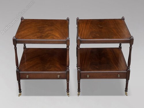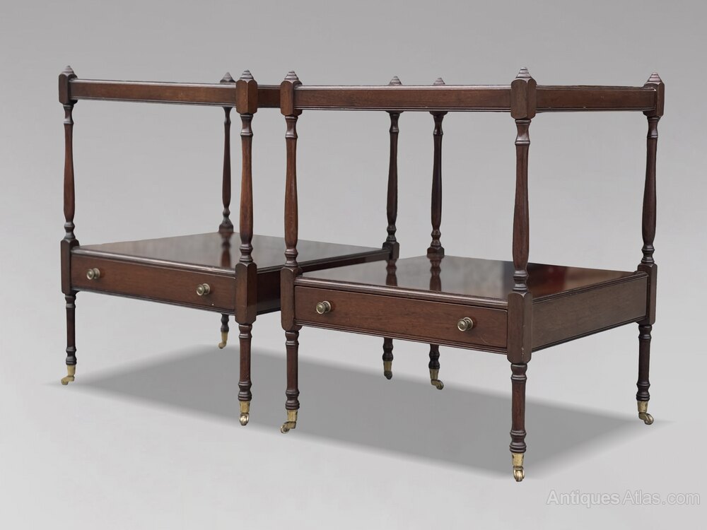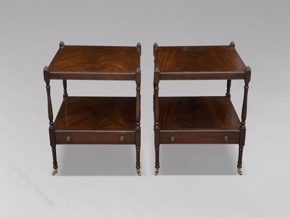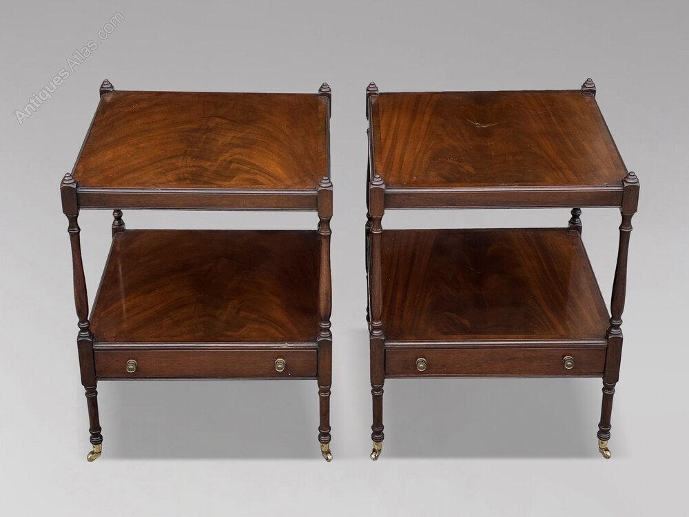 A Good Quality Pair of Georgian Regency Style Figured Mahogany Whatnot Side Tables, Bedside Tables or NightstandsA good quality pair of Georgian Regency style figured mahogany whatnot tables, circa 1910, in excellent original condition and ideal for use as bedside or lamp tables.