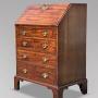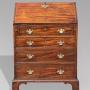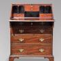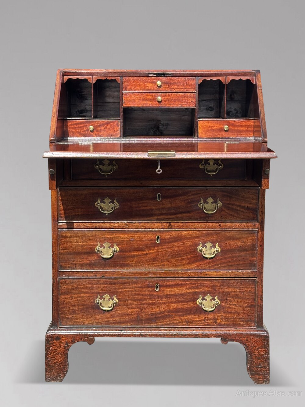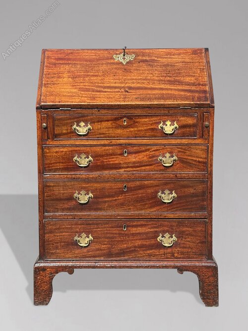 Small Untouched 18th Century George III Period Figured Mahogany BureauA stunning George III mahogany bureau of unusually small proportions. This charming late 18th-century George III period finely figured mahogany bureau showcases exquisite craftsmanship and timeless appeal. The fall front with brass escutcheon and original lock, opens to reveal a well-organized fitted interior, consisting of two central drawers with pigeon holes and drawers to either side. This leads down to an arrangement of drawers, the bureau is fitted with four long graduated drawers, all adorned with elegant original carved brass handles and escutcheons. The piece stands proudly on original bracket feet, the sides in solid mahogany, the back in original oak boards, all contributing to its classic design. Made in England, circa 1780, this bureau bookcase boasts a rich mahogany colour and is in superb original condition.