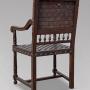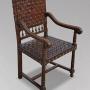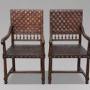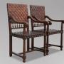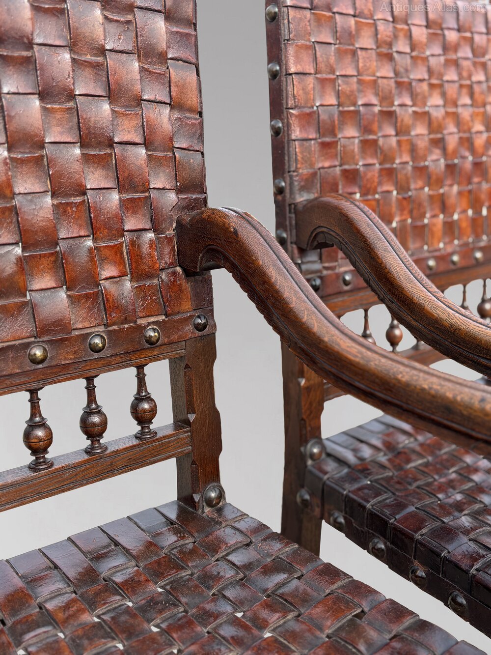Very Decorative Pair of 19th-Century Oak and Woven Leather ArmchairsA very handsome pair of late 19th-century Carolean revival oak and woven leather carver armchairs, combining strong architectural presence with great decorative appeal. Each chair features a rectangular woven leather lattice back, secured with brass studwork and set above a row of turned spindle gallery. The generous seat, also in woven leather lattice within a studded frame, is complemented by beautifully carved, shaped downswept scrolling arms on turned supports. The chairs stand on turned legs united by square stretchers and terminating in bun feet, with a wonderfully decorative, country-house feel.