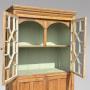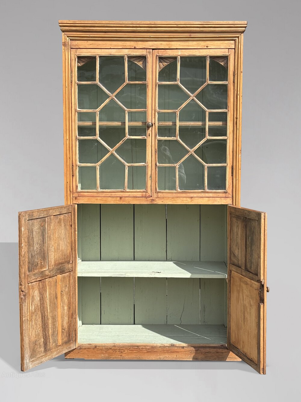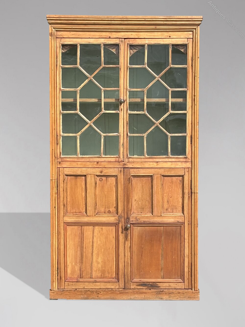 This well proportioned two door bookcase or kitchen cupboard features a square moulded cornice over a pair of astragal glazed doors, opening to a painted interior with a fixed shelf. Below are two panelled cupboard doors offering generous enclosed storage, the whole standing on its original plinth base. The sides are fully panelled, and the piece still has its original planked back. The cabinet has its original glazing, a beautifully mellow patina, and rich, warm colours that have developed over more than 200 years of gentle use. Completely honest and untouched, it has the true “country house” look that is now increasingly hard to find.
