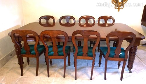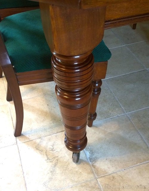 This 19th Century two leaf mahogany dining table is in lovely condition. An extending table that has good graining and good colour. There are two leaves that can be used in the table to seat ten or removed to seat 8 with one leaf and 6 with no leaves. This table has a nicely turned leg and sits on the original castors. The double winding bar is from Joseph Fitter in Birmingham and has the original brass plaque. This Victorian 10 seater table is just under 8ft by 4ft when fully extended. If this style suits you, it would be difficult to find a better example if not impossible.