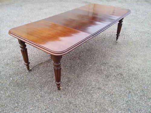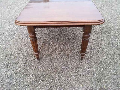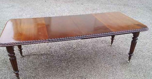 A Victorian 10 seater dining table in Mahogany with a good turned and reeded leg. This two leaf extending table with a popular rounded corner has just come from a local house. Having been used with the leaves out, hence the differing colour it is available at possibly the best price for a Victorian clean polished 10 seater table anywhere. There is some old staining which is underpolish and has clearly been there for years. Possibly now only showing because of the light fade on the main table. For Sale at only £950 this is about a third the original cost I am told. We can undertake any work the purchaser may require of course, but the current finish is very good indeed and almost looks as if it has only been used a few times since restoration many years ago. All in all a clean and tidy table that is very useable for a tiny price. This could of course be restored and repolished now or in the future, be this when funds are available or at a time that is more opportune ......................Please note our opening arrangements when calling..........SORRY NOW SOLD.............