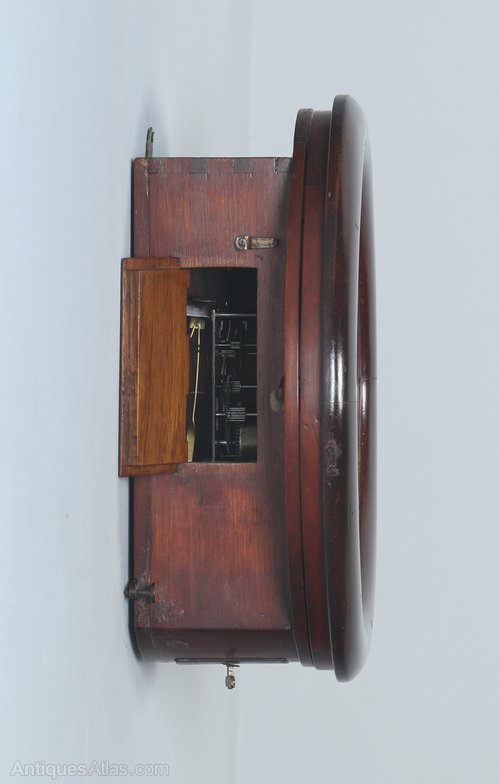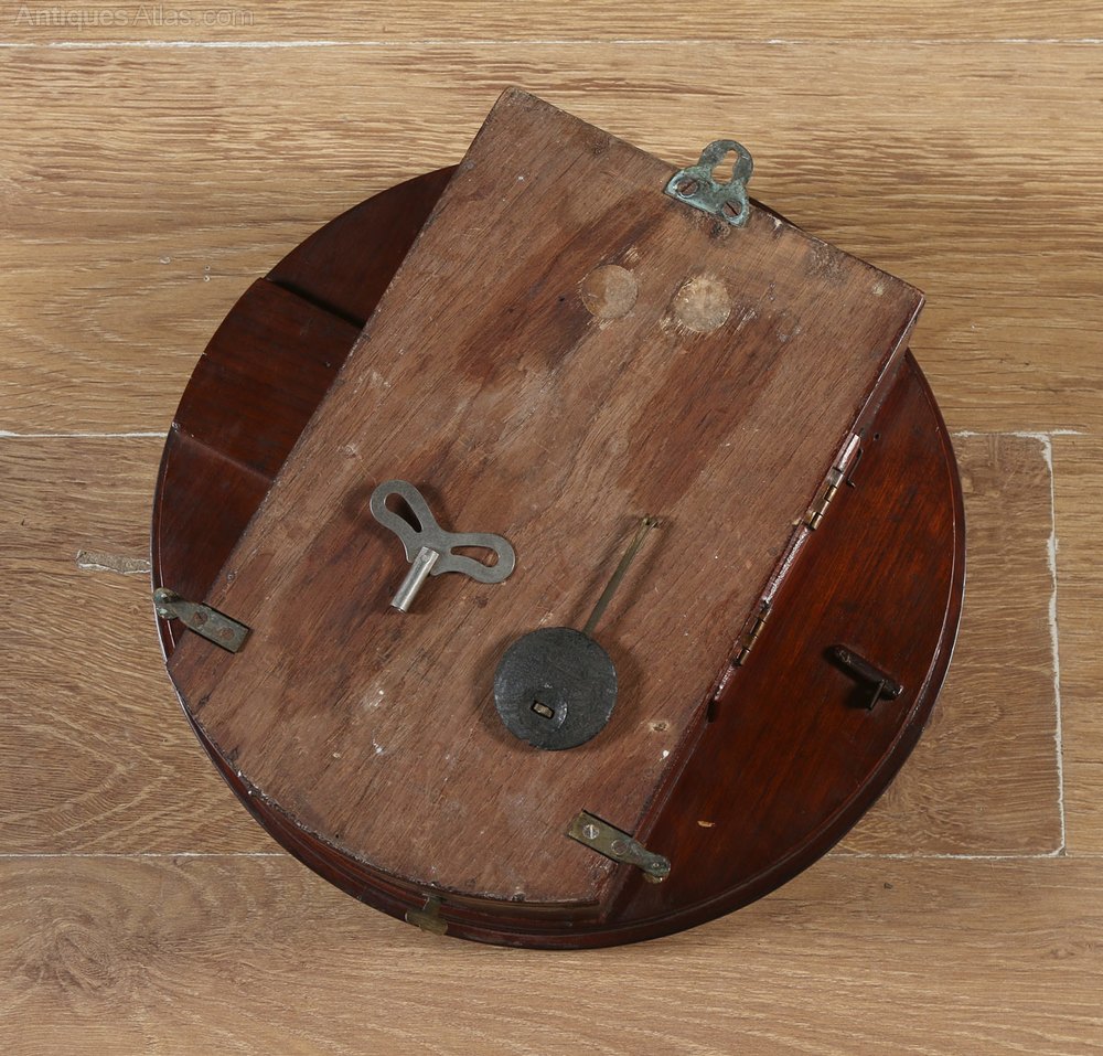 The mahogany case has been fully refurbished, including French polishing to give a dark ebony style finish. This clock features a “deep dish” case design which means that case is of better quality and is slightly deeper in depth than the 16” antique clocks. On the back of the clock is a bracket to attach the clock to the wall.