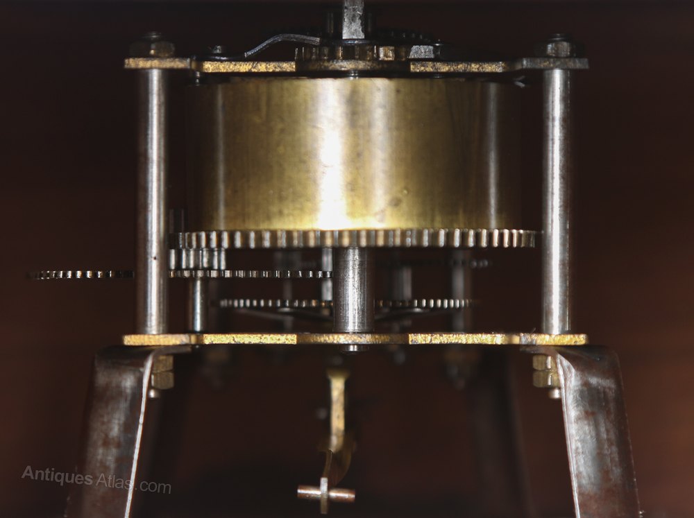 This clock houses a top-quality single brass barrel spring driven mechanism, which although not stamped, we believe it to be made by Enfield, as the design is identical to other Enfield dial antique clocks made at the time (not all their mechanisms were stamped).