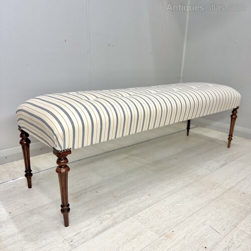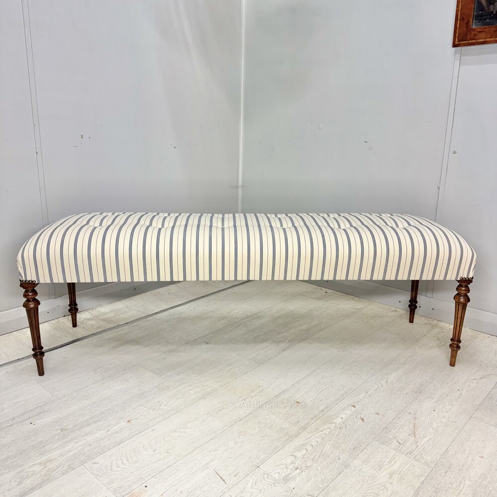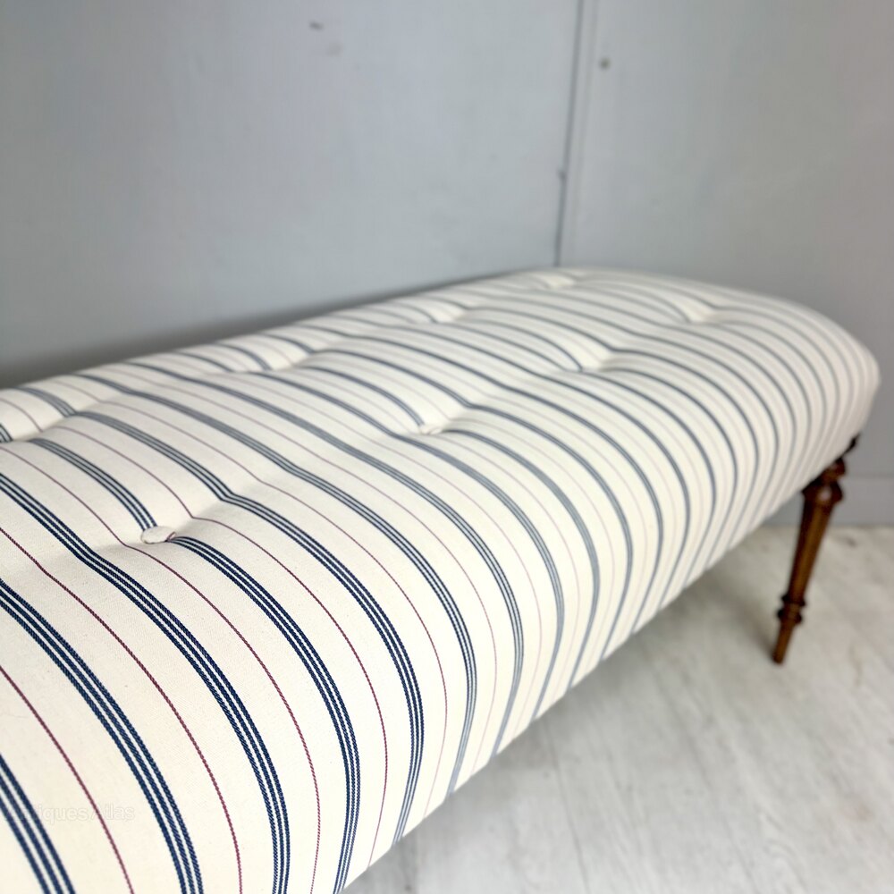 Very elegant long stool in buttoned blue and red pinstripe ticking stripes and standing on 19th century turned and tapered walnut legs.