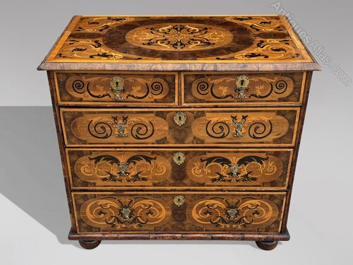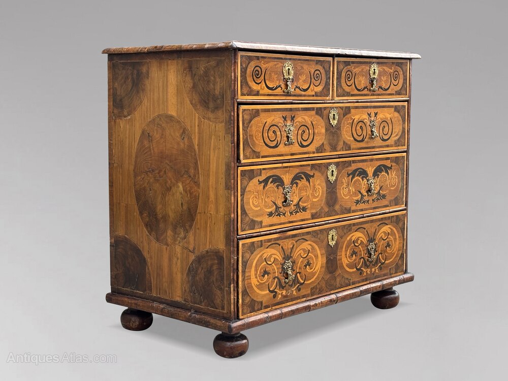 Historically significant, this rare chest of drawers is made from walnut and exhibits excellent original condition. Crafted during the end of the 17th century, it reflects the influence of master Dutch cabinetmakers who were attracted to the English court, introducing sophisticated techniques that transformed English antique furniture design. The fine quality marquetry features stylized scrollwork constructed from various timbers, creating a stunning three-dimensional effect, while the chest boasts a deep glow and rich patination, showcasing plenty of variation in colour.