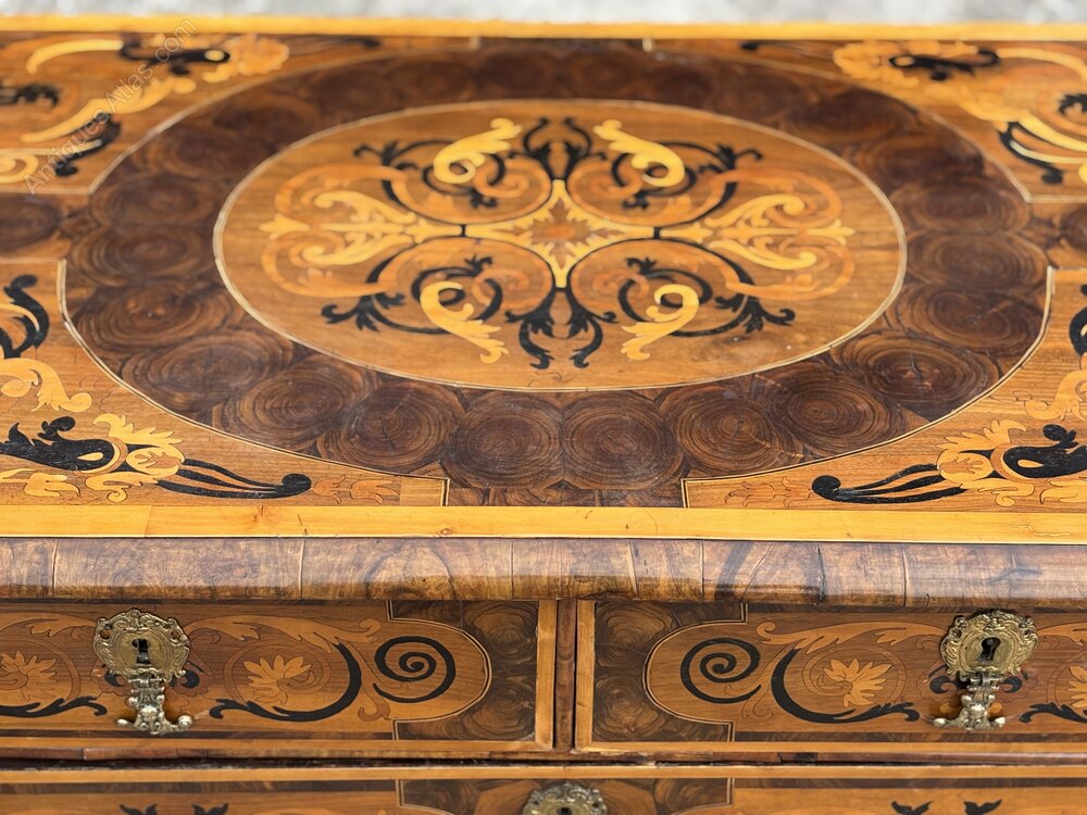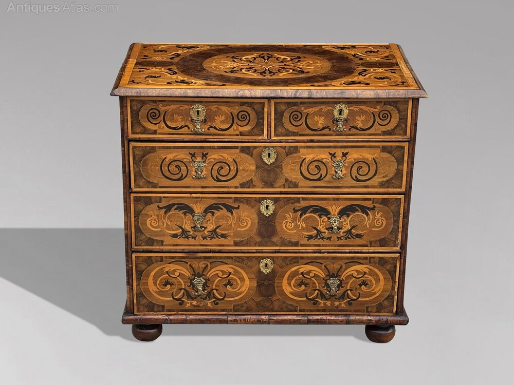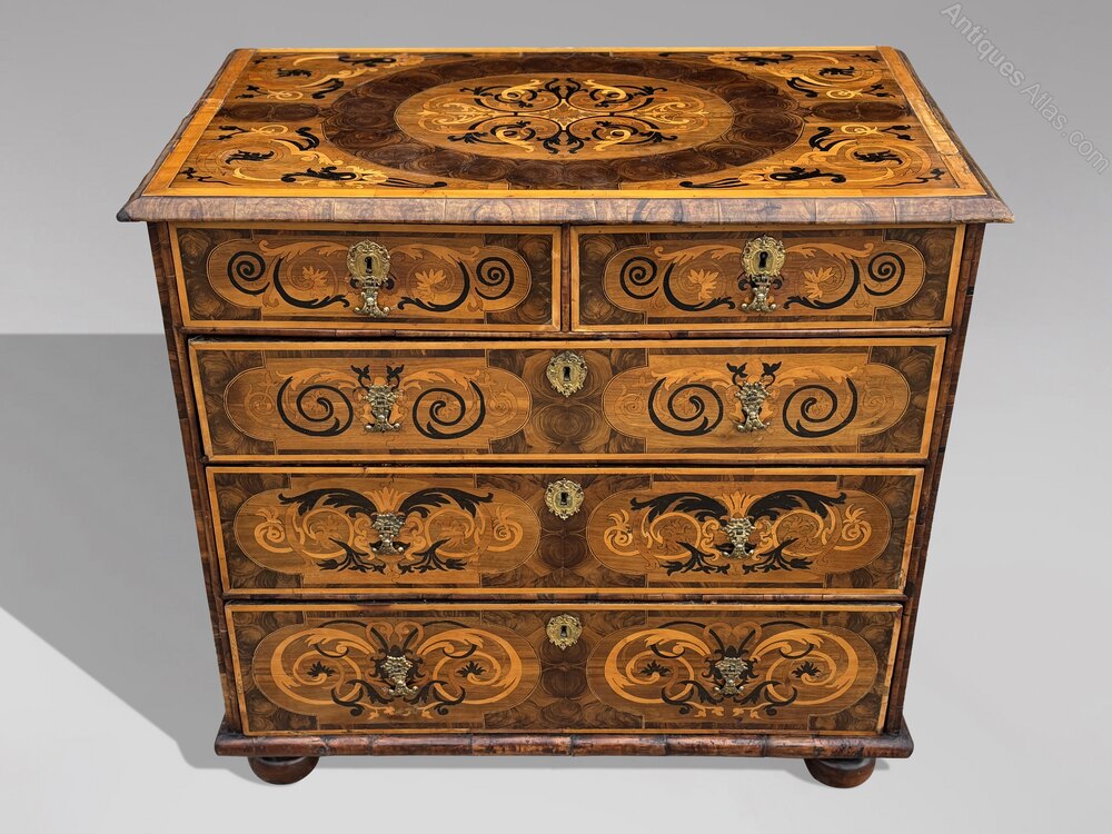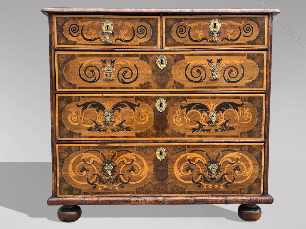 Very Fine 17th-Century William and Mary Period Marquetry Inlaid Oyster Walnut Chest of Drawers