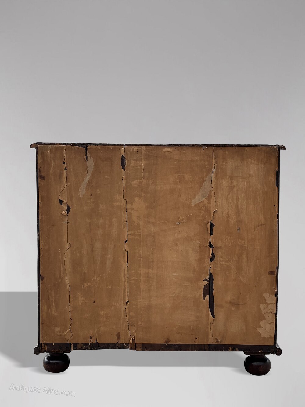 This exquisite chest of drawers exemplifies the craftsmanship of the late 17th century, showcasing the artistry of the William and Mary period. It features a finely crafted moulded rectangular top inlaid with laburnum oyster, adorned with intricate scrolling foliage and flower heads. The chest of drawers includes two half-width drawers and three full-width graduated drawers, all displaying conforming marquetry inlaid ebony panels that enhance its elegance, and fitted with ornately cast brass scrolled drop handle and escutcheons, and it is raised on charming later bun feet.