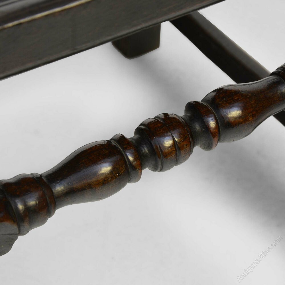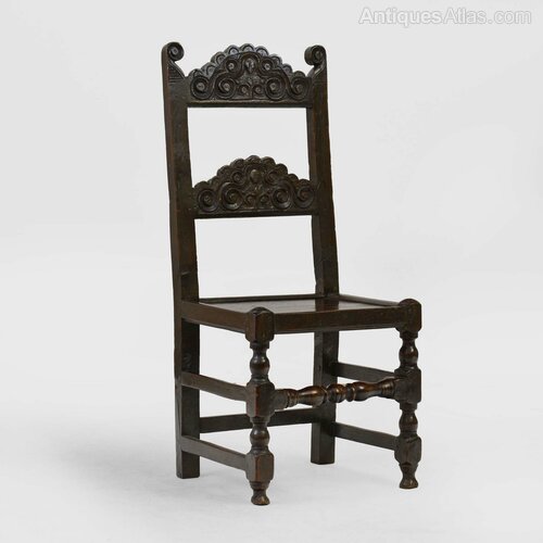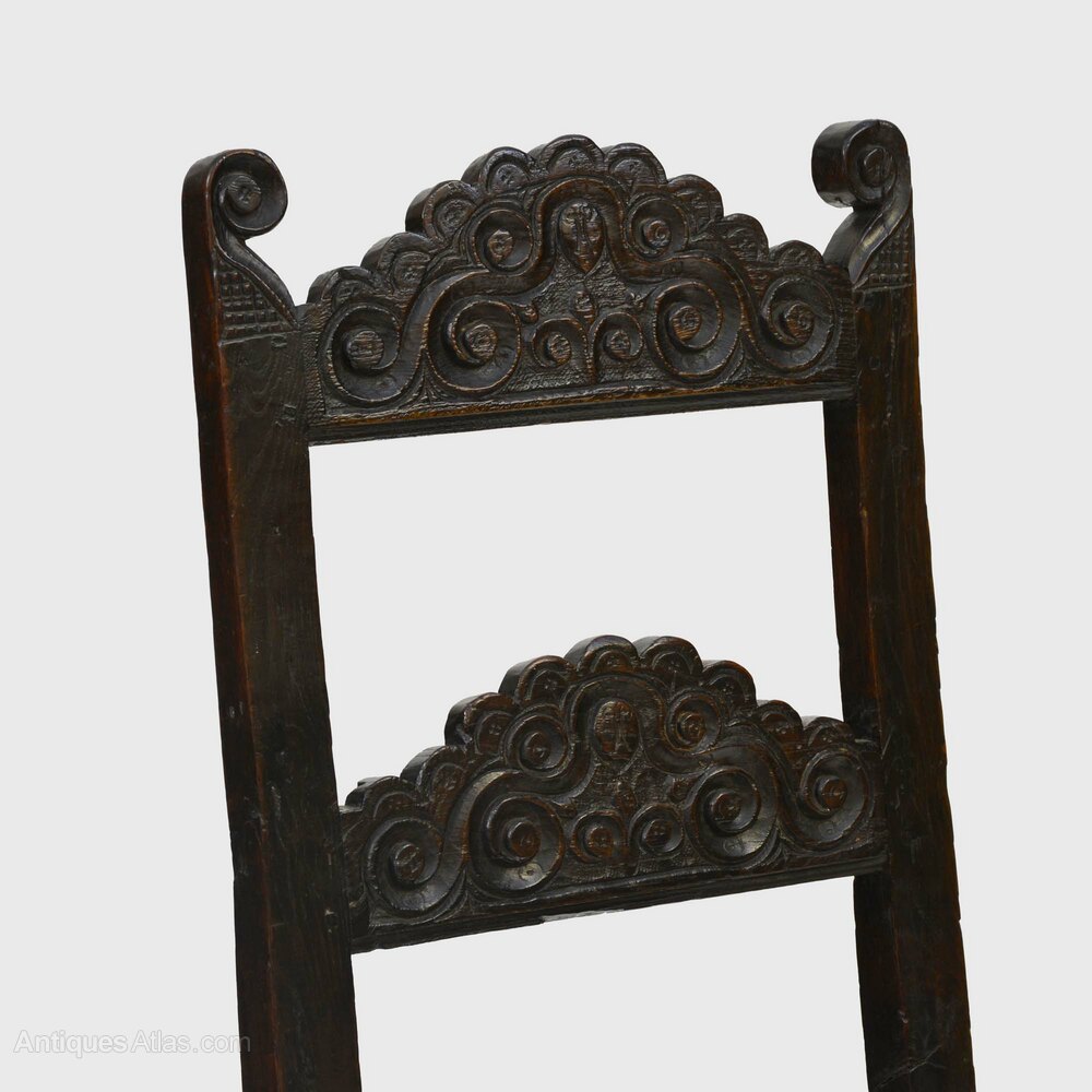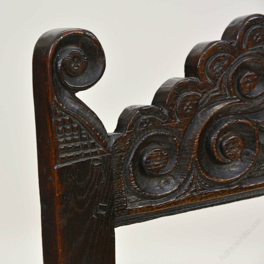 17th century South Yorkshire oak backstool, the two scroll carved arched back to panelled seats over turned and railed under-frame.