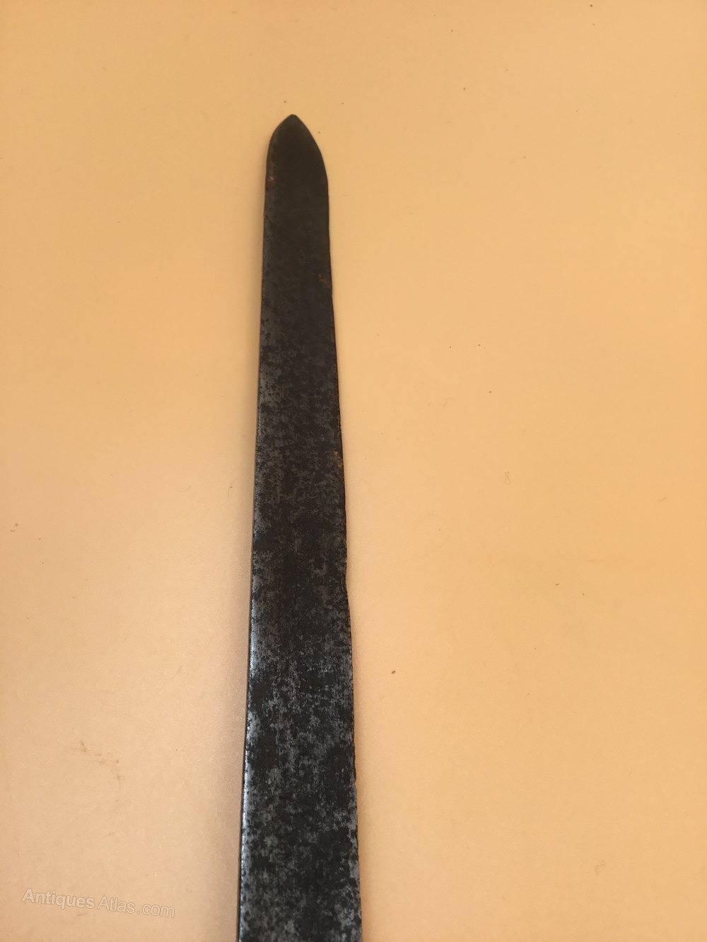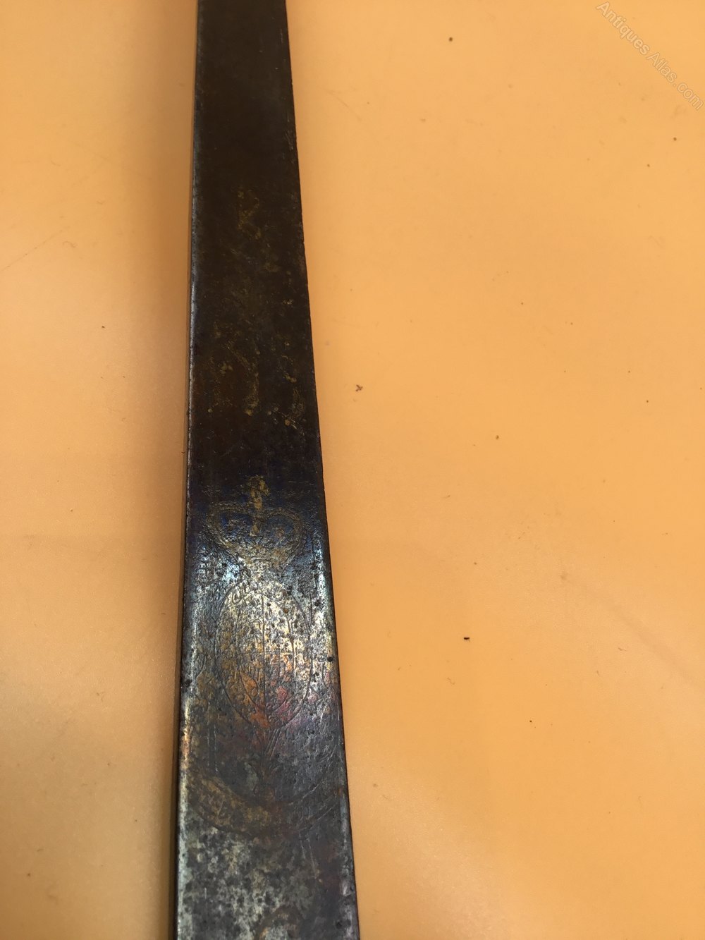 Has seen better dates , condition is not great you can still see some of engravings on blade through the rust and may clean up a bit , but an original well used sword blade measures 26 inches , good example to hang on the wall for a fraction of the price till a better one turns up