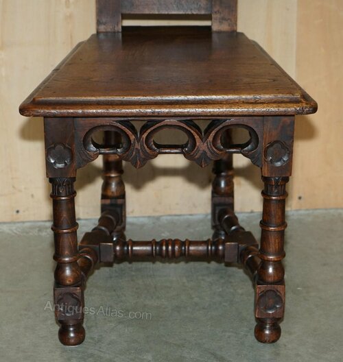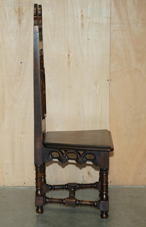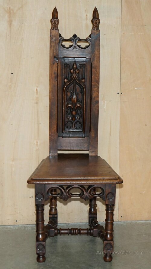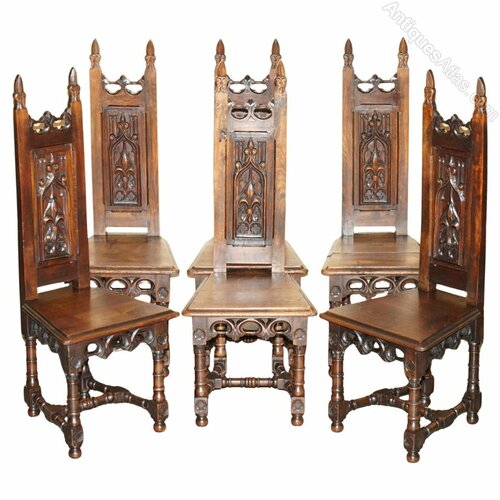 A very decorative and well-made set, each chair has a steeple back which is a nod to their gothic inspiration, just look at a medieval church and you will see what I mean.