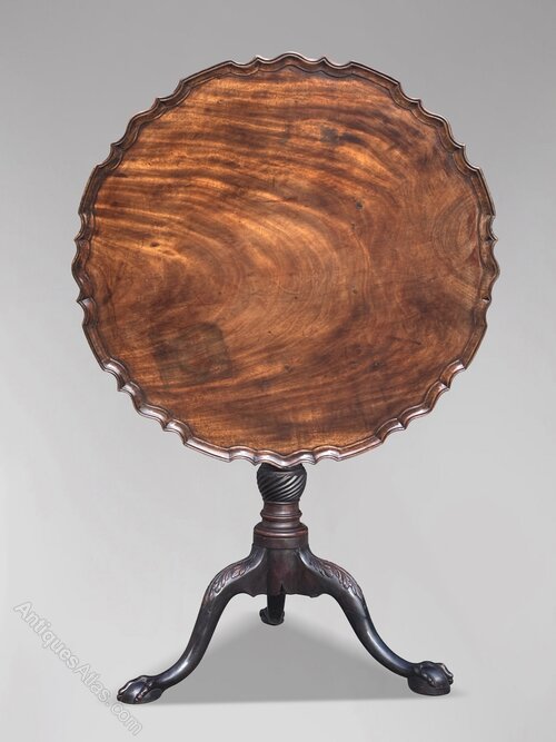 A very fine 18th-century George III period mahogany tripod table. This table consists of a solid well figured mahogany tilt top, with pie-crust edge, above a turned baluster-form column. This fine quality Georgian table is raised on well-drawn outswept carved cabriole legs that terminate in fine ball and claw feet, retaining a good original colour and rich patination. The tilt-top includes the original catch and dates to circa 1770.
