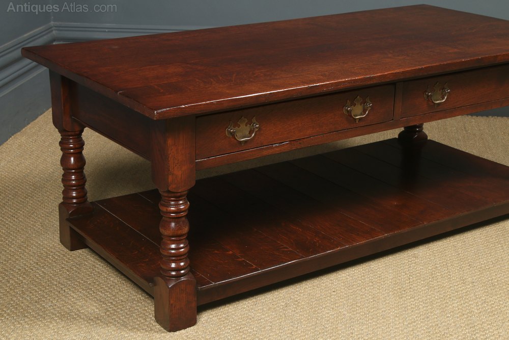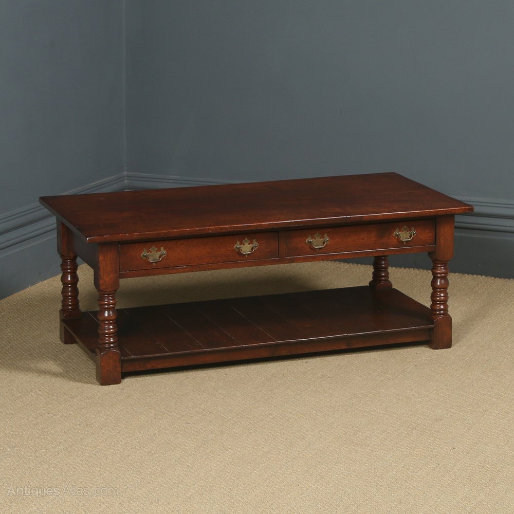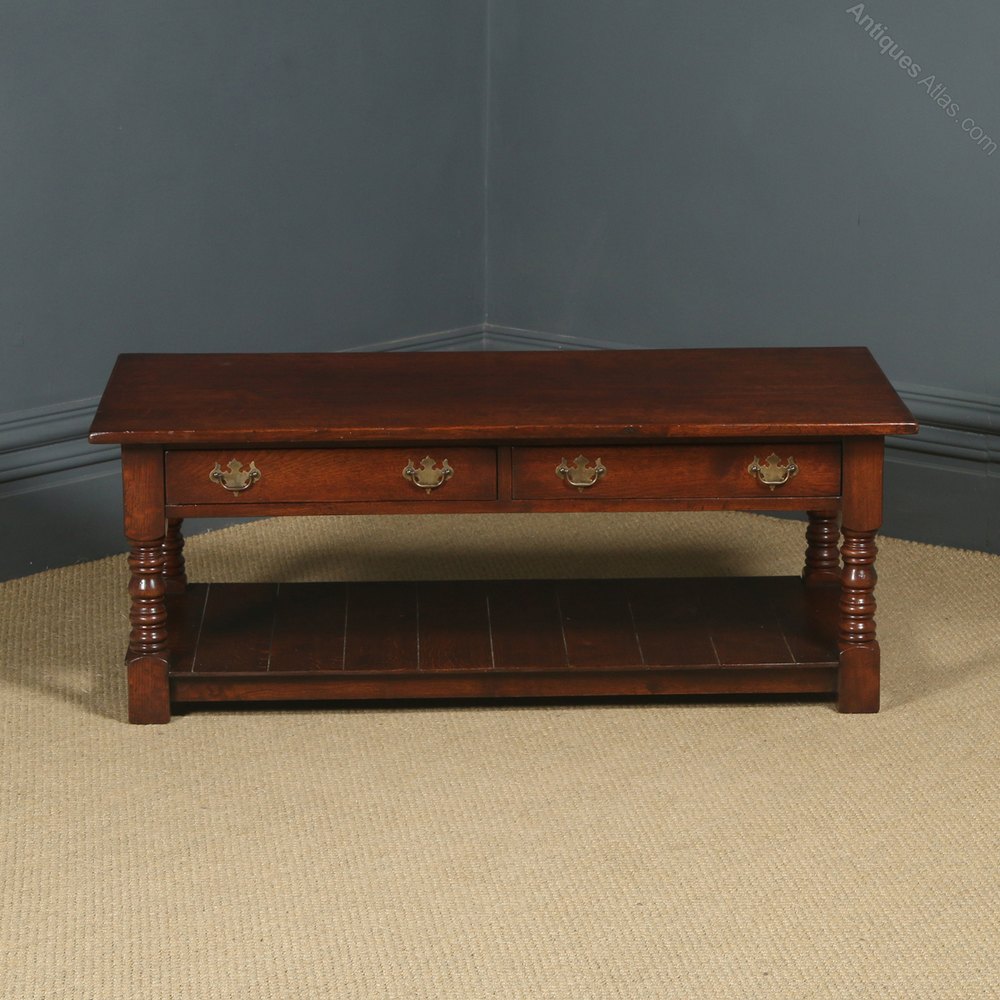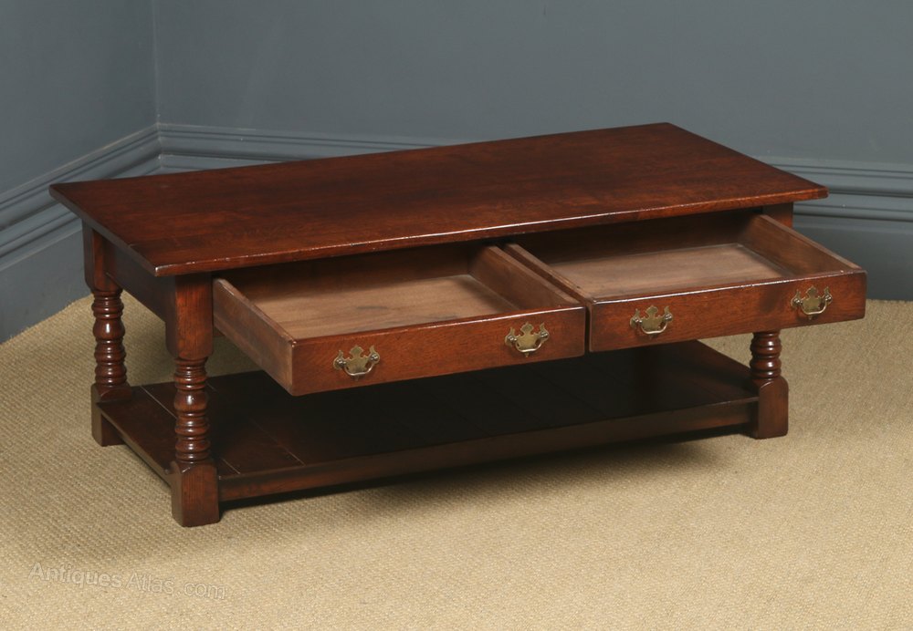Condition This is a fine quality English 18th century style solid oak coffee table, circa 1980, made in Ipswich, displaying a rich oxblood colour, in excellent original condition. Nominal old use marks to the leading edges, but nothing significant considering the age of the item. The oak coffee table has been cleaned and wax-polished to a professional standard in our workshop. The drawers are constructed with dovetail joints they run smoothly and close flush to the frame and retain their original brass swan neck handles. There are no breaks to the frame or legs. The 18th century style coffee table is well constructed and solid in joint and ready to use.