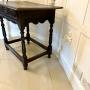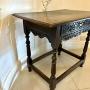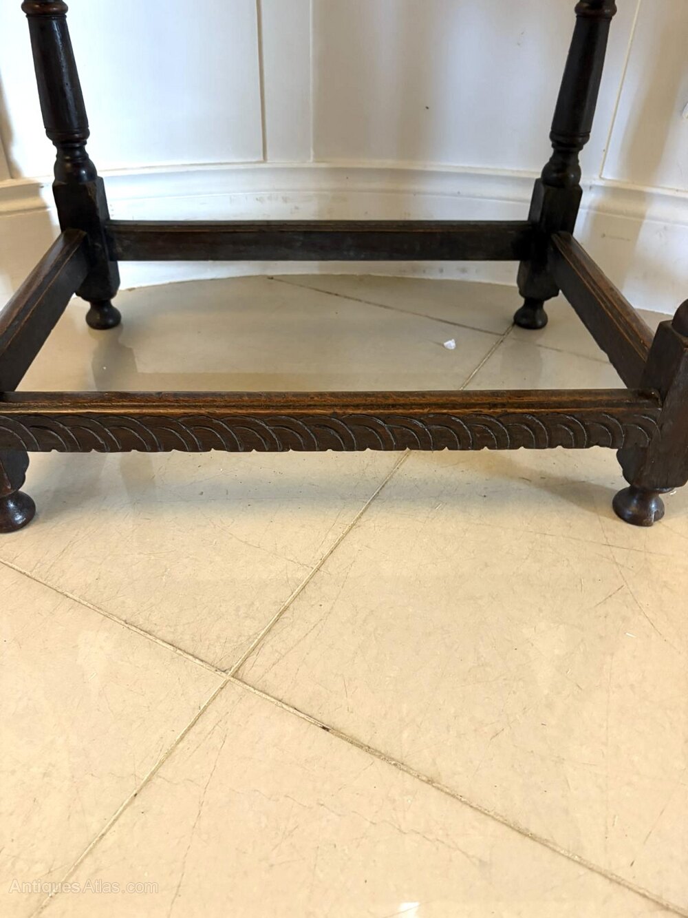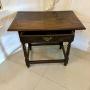 18th century antique quality carved oak side table having a quality oak top with a moulded edge above a single carved oak drawer with original brass handle supported by turned tapering columns standing on turned feet united by a carved oak stretcher.