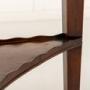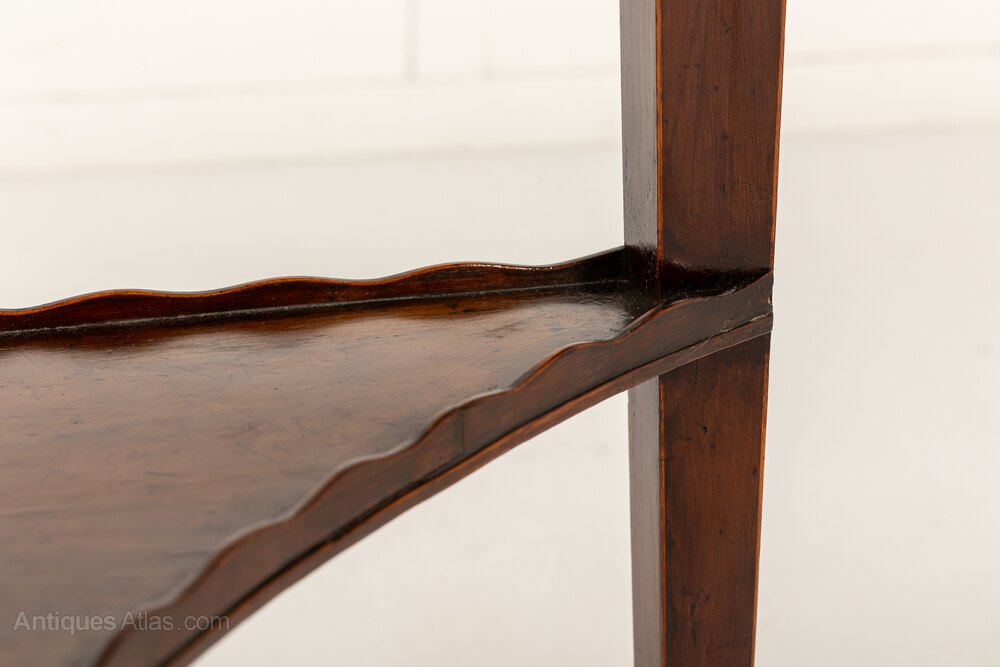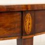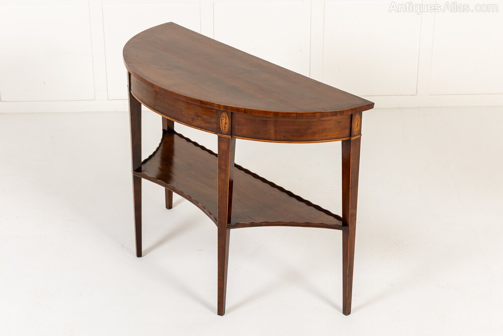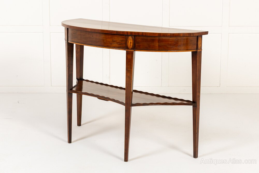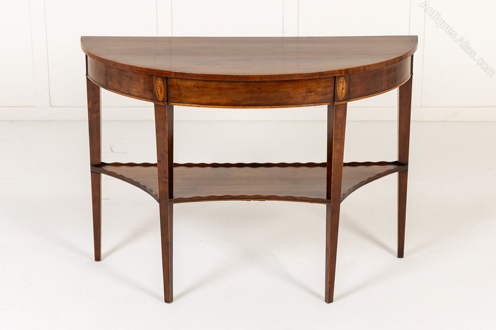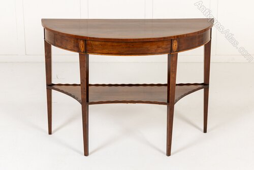 This lovely piece is of demi lune shape and has a shaped undertier with inverted edges and unusual wavy edge moulding that creates a gallery. At the top of each of the four legs is an inlaid shell patera. The table is veneered in yew wood and there is contrasting stringing at the base of the apron and running down the sides of the legs. The top is also crossbanded and the timber used throughout is of good figure and colour.