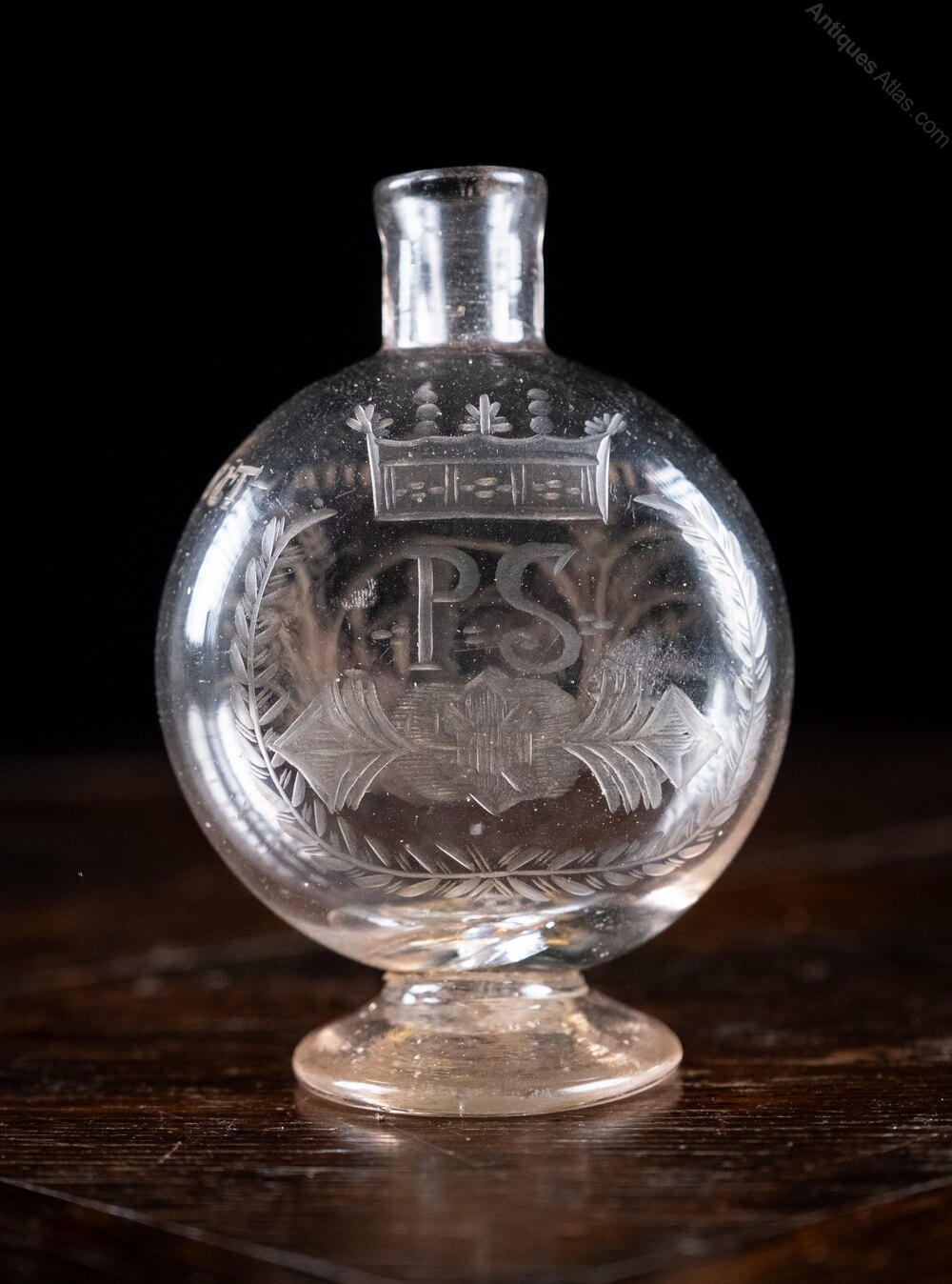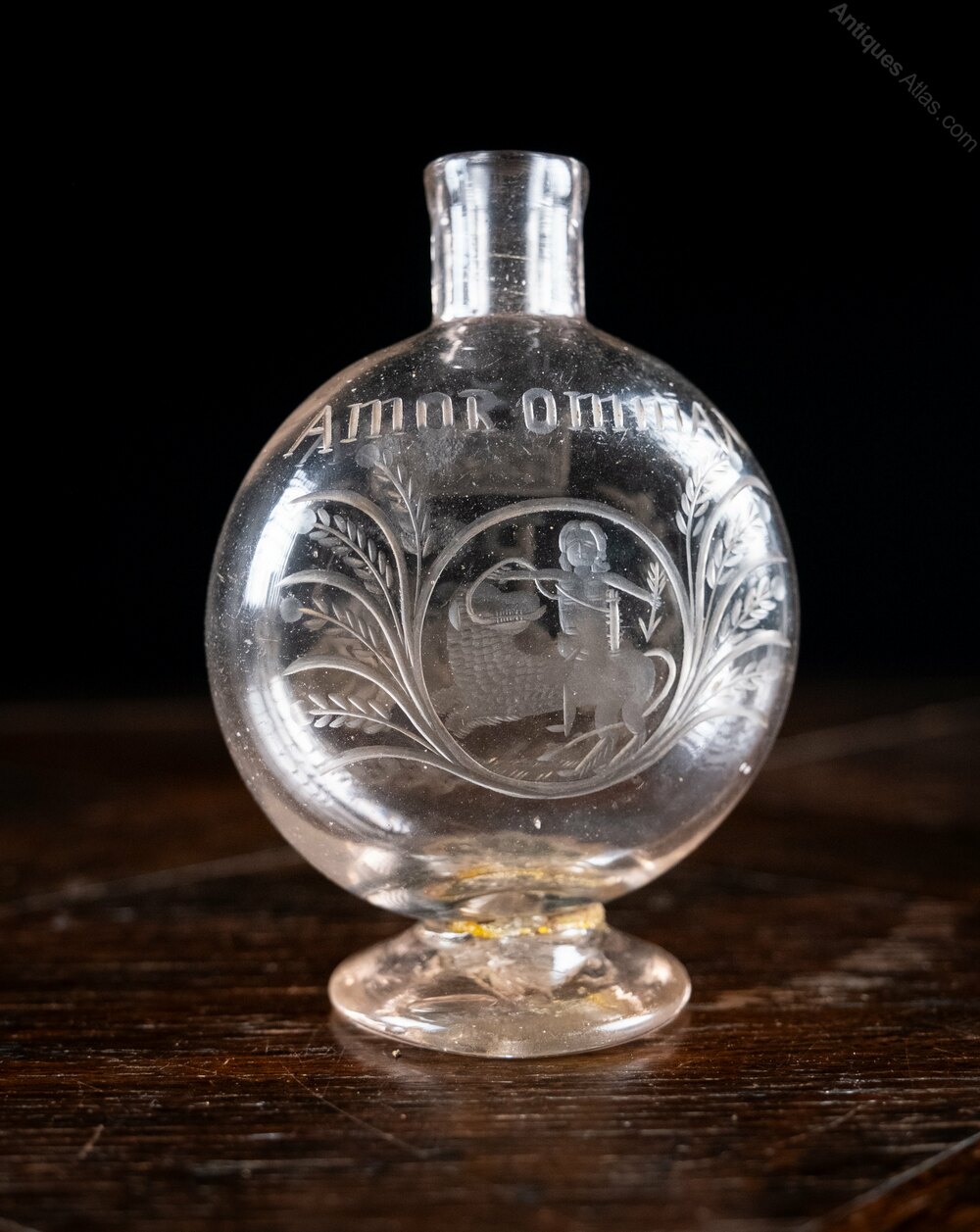 The glass flask is engraved on both sides. One side has the initials 'P.M' beneath a crown. The other is decorated with a scene of a child riding a mythical creature beneath the latin phrase 'Amor Omnia Vincit' ('Love Conquers All'). The flask has an historic repair to the foot but otherwise remains in a good condition, with all the character one would expect in a glass piece of this age.