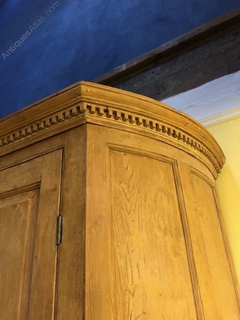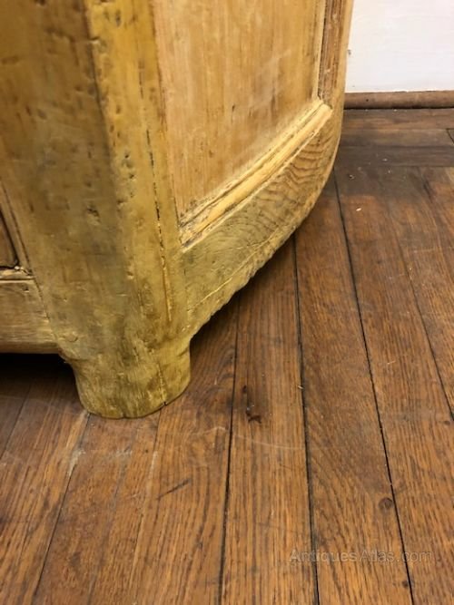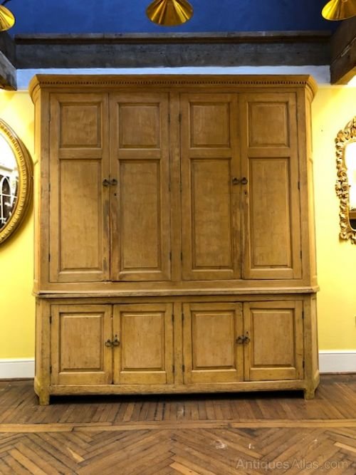 A wonderful and rare example of an 18th century dry scraped housekeepers cupboard, standing on stile feet with four fielded panelled doors top and bottom, the ends beautifully bowed, the top with a gentle understated dentil cornice, removed from Standen Hall, Clitheroe, Lancashire