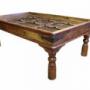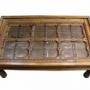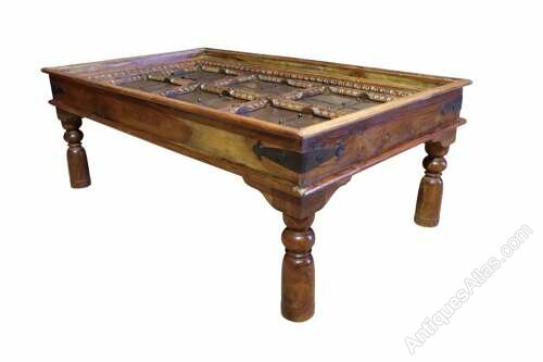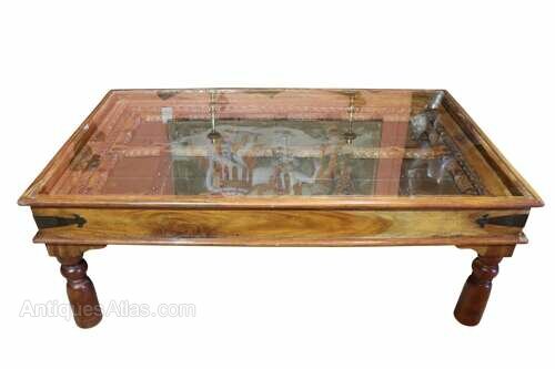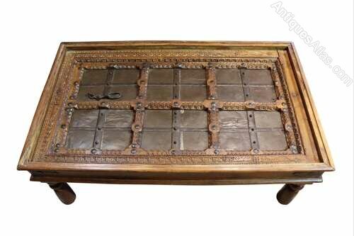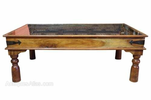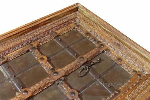 A striking coffee table created from an 18th-century Indian metal-lined teak panel door, now beautifully mounted on a solid teak base and finished with a protective glass top. The original panel features intricate hand-carved detailing and forged metal strapping. The warm tones of the teak frame complement the aged patina of the ironwork, creating a unique blend of history and functionality.