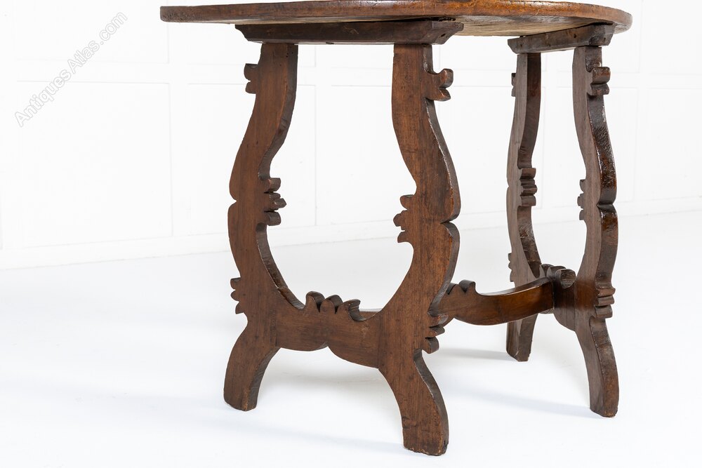 The top of the table is of demi lune or D shape. The table base is made up of two carved end supports, set at angles, which are linked by a curving stretcher. It is constructed in walnut and has a good colour and patination.