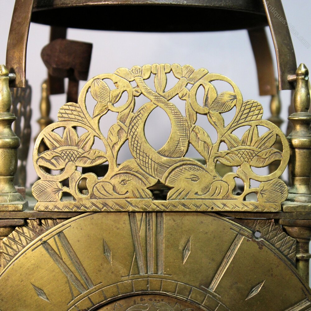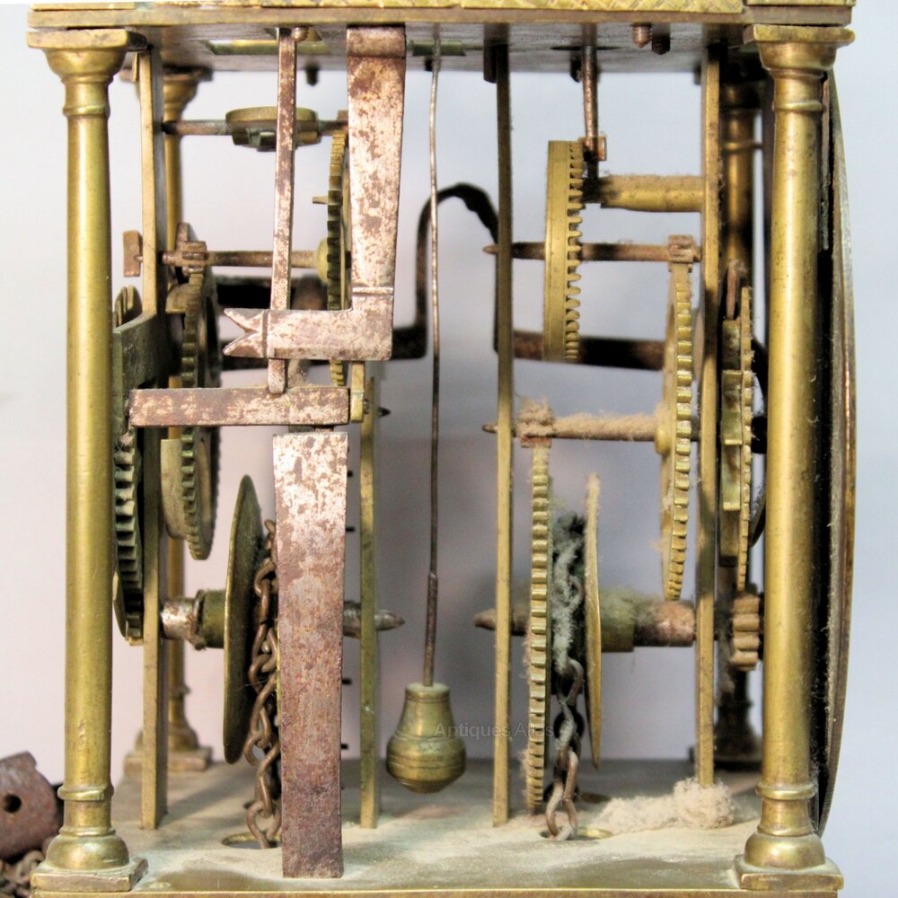 Condition The clock is dirty and dusty but surprisingly, shows very little signs of wear and the wheel trains run very smoothly. The verge escapement is well-set and runs with a little thumb pressure - as does the striking train. The bell, carrier and top finial are not original but every other part - even the square-headed top screws appear totally original. All of the alarum work, setting disc, back plate, side doors, weight and hoop and spikes are missing, probably broken off during a fall from the wall which is so often the case. All of the brass has tarnished and resembles bronze.
